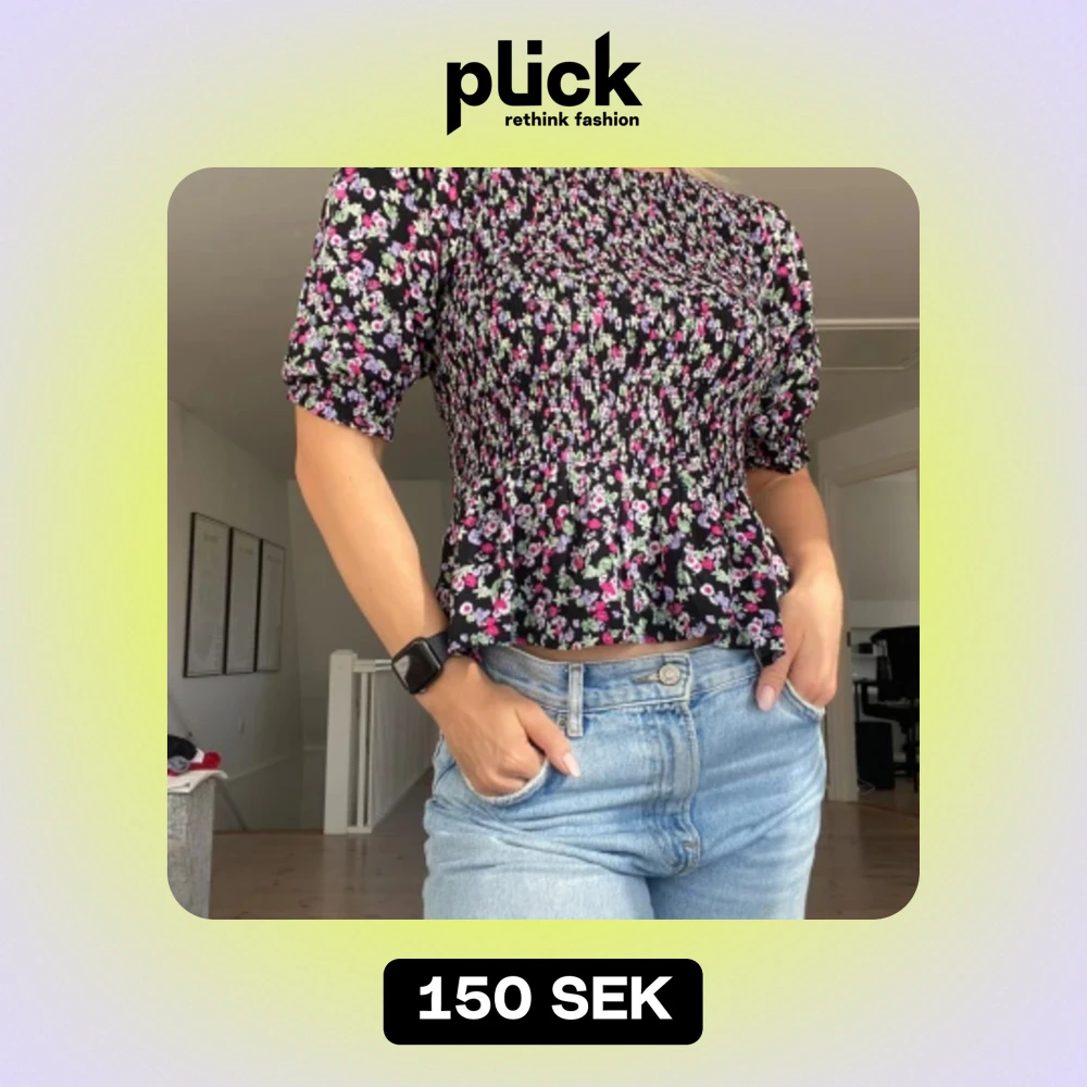 Blommig top, åtsittande med volang och puffärmar. Sparsamt använd!