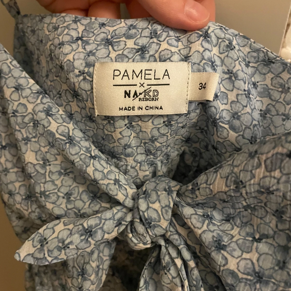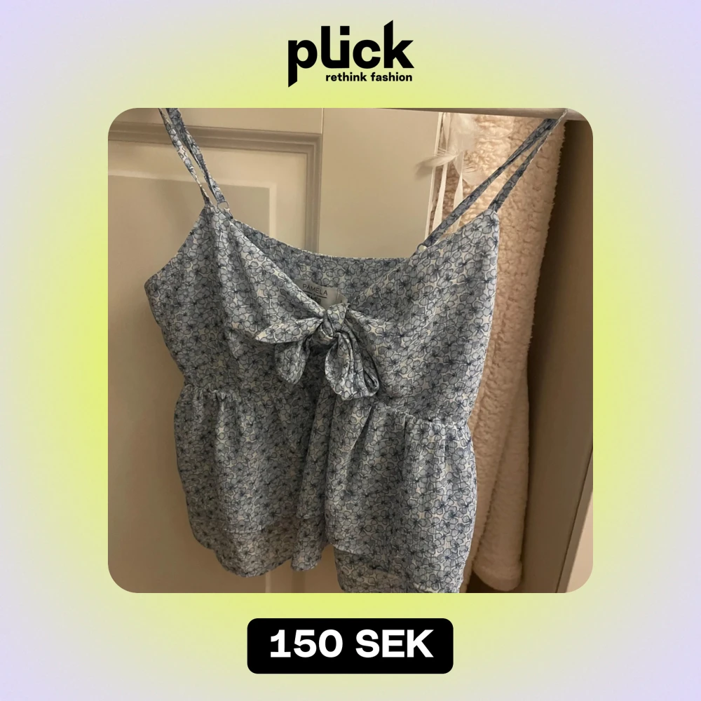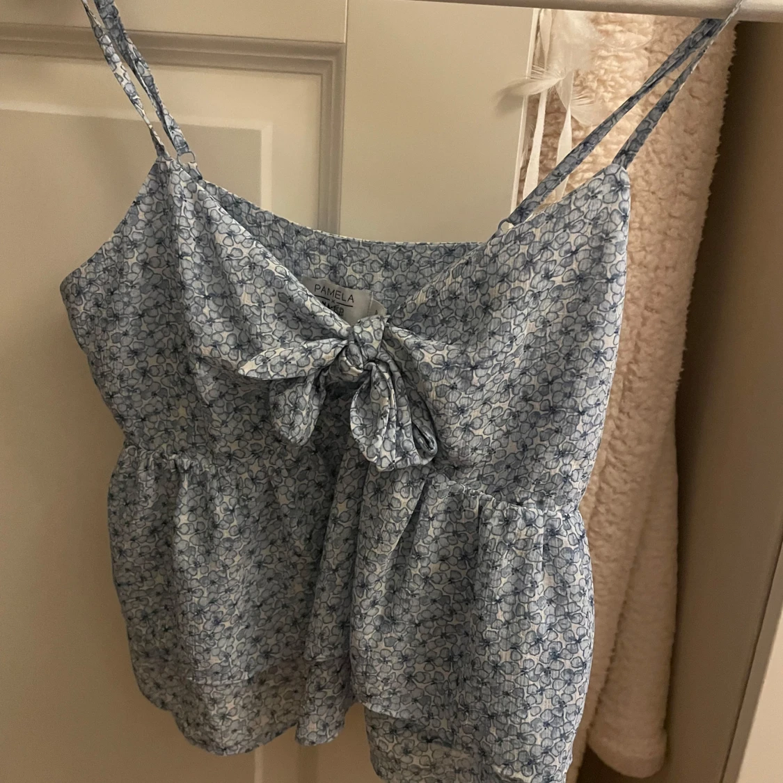 Söt blommig topp från NA-KD i ljusblått med smala axelband och knytning framtill. Band som går att justera och knappt aldrig använd🩷
