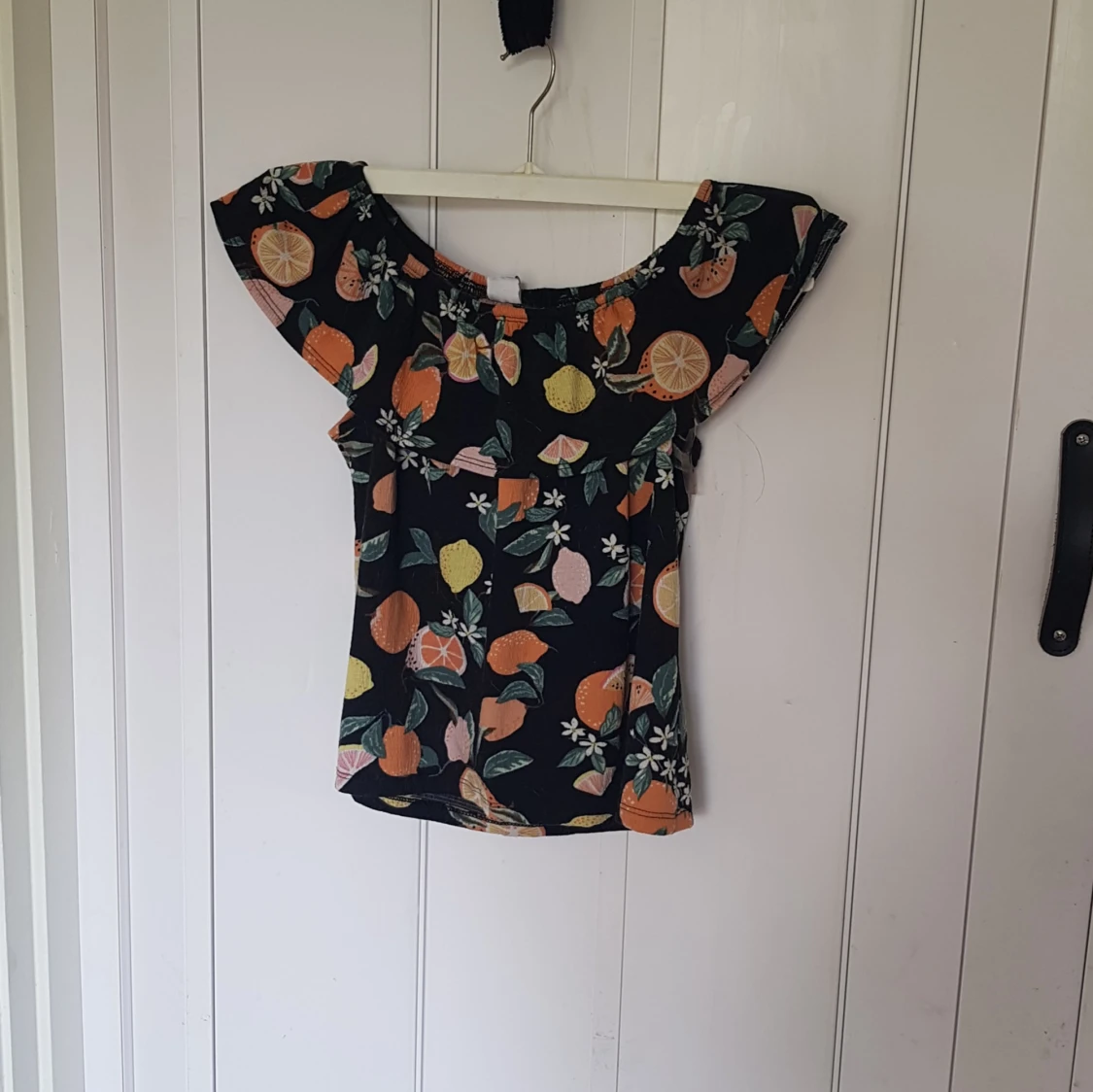Snygg topp från Lindex med färgglatt citrusmönster i orange, gul och rosa på svart botten. Modellen har breda volangärmar och en offshoulder-look. Perfekt för dig som gillar färg och vill sticka ut lite extra i sommarvärmen!