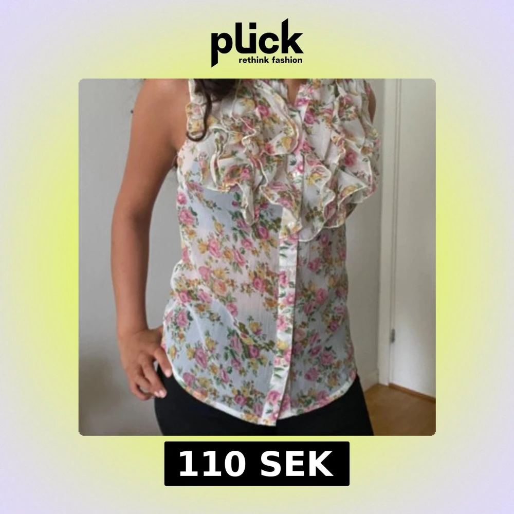 Supersöt blus med blommigt mönster. Blusen är ärmlös och har volanger.