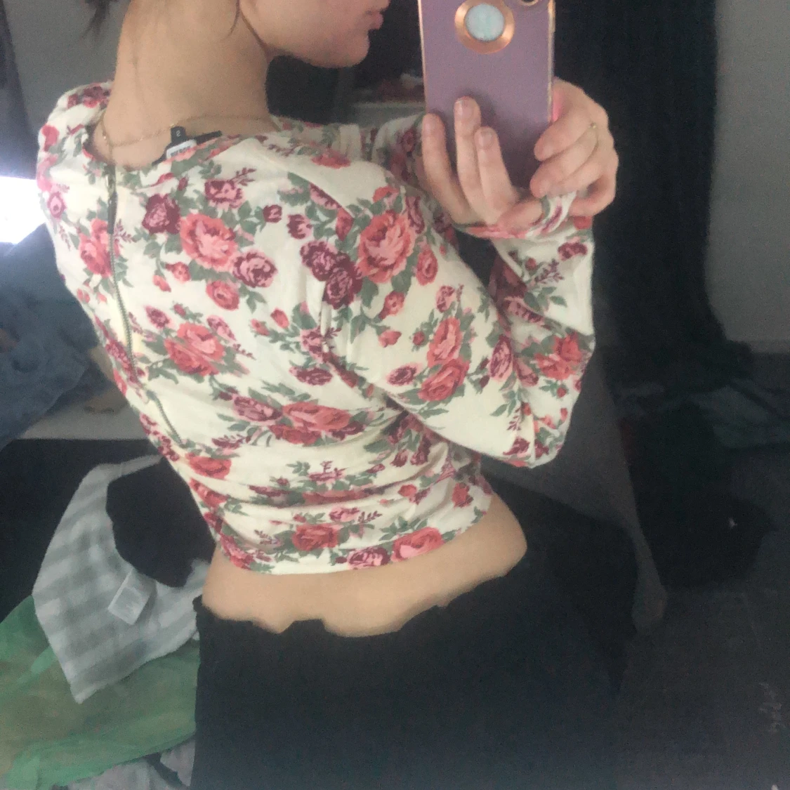 Den är från bikbok. Blommig tröja passar folk för xs,s. Lite kortare . Väldigt skön material och sitter fint.