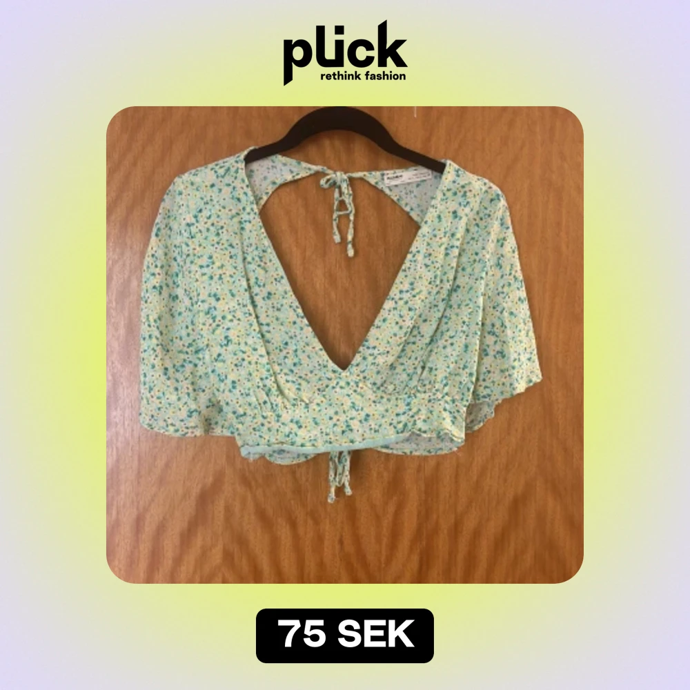 Säljer en superfin blommig croppad topp från pull & bear. Den har en djup v-ringning och öppen rygg med knytband. Toppen är i en ljusgrön nyans med små blommor i blått och gult. Perfekt för solsemester eller en fest kväll!