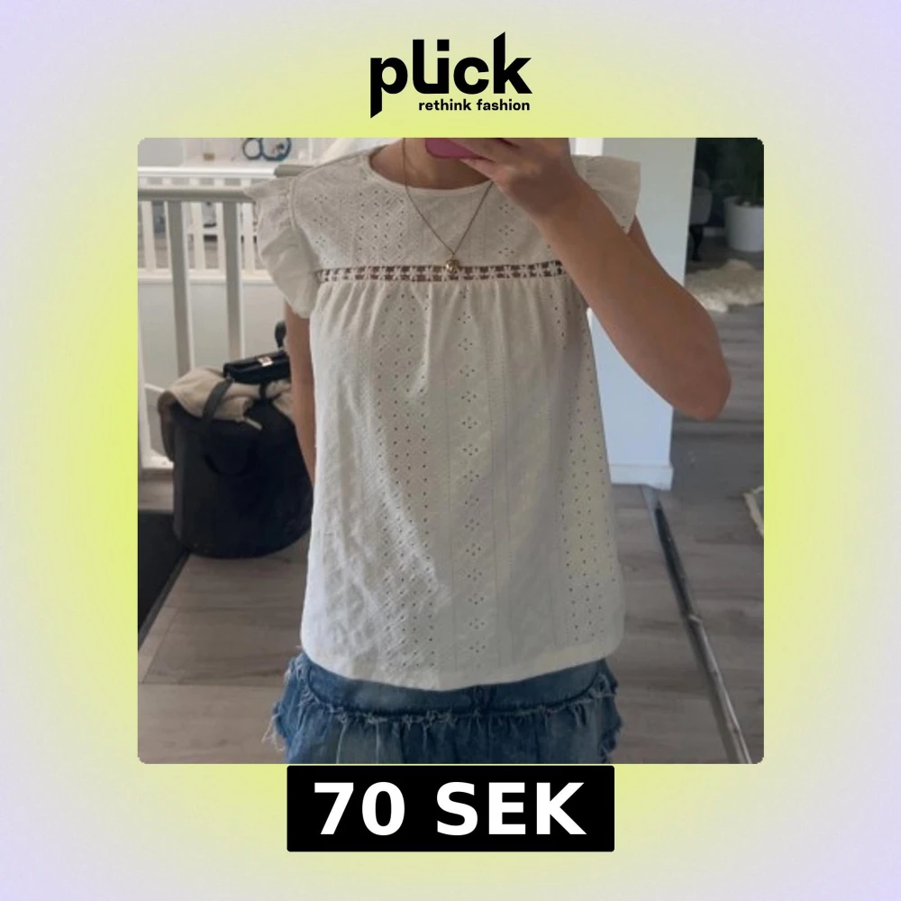 Supersöt vit blus med broderade detaljer och smĂ„ hĂ„lmönster. Blusen har volangĂ€rmar och en fin spetskant med blommor över bröstet. Perfekt till jeans eller kjol för en frĂ€sch look. Materialet kĂ€nns lĂ€tt och luftigtđđ