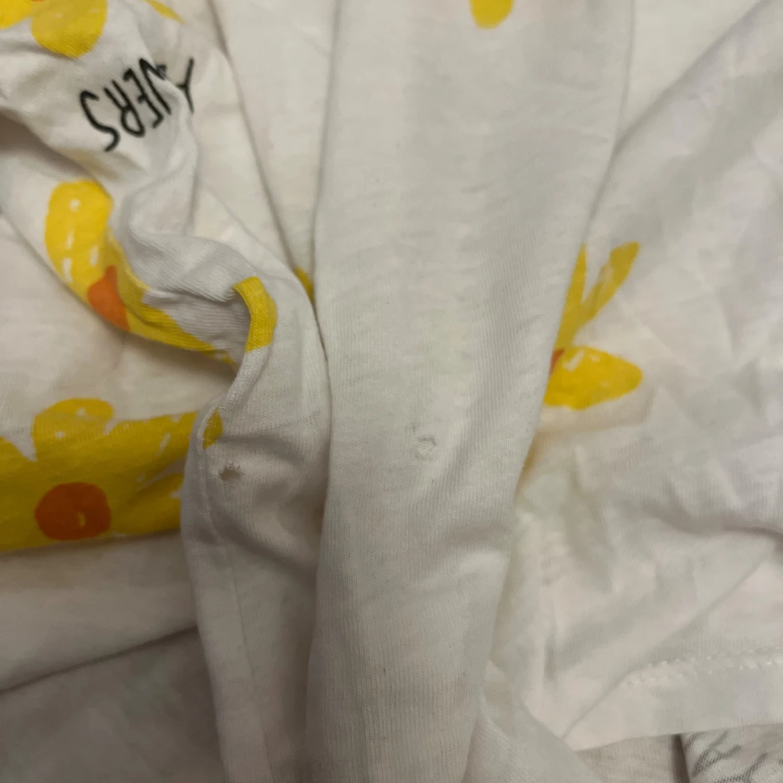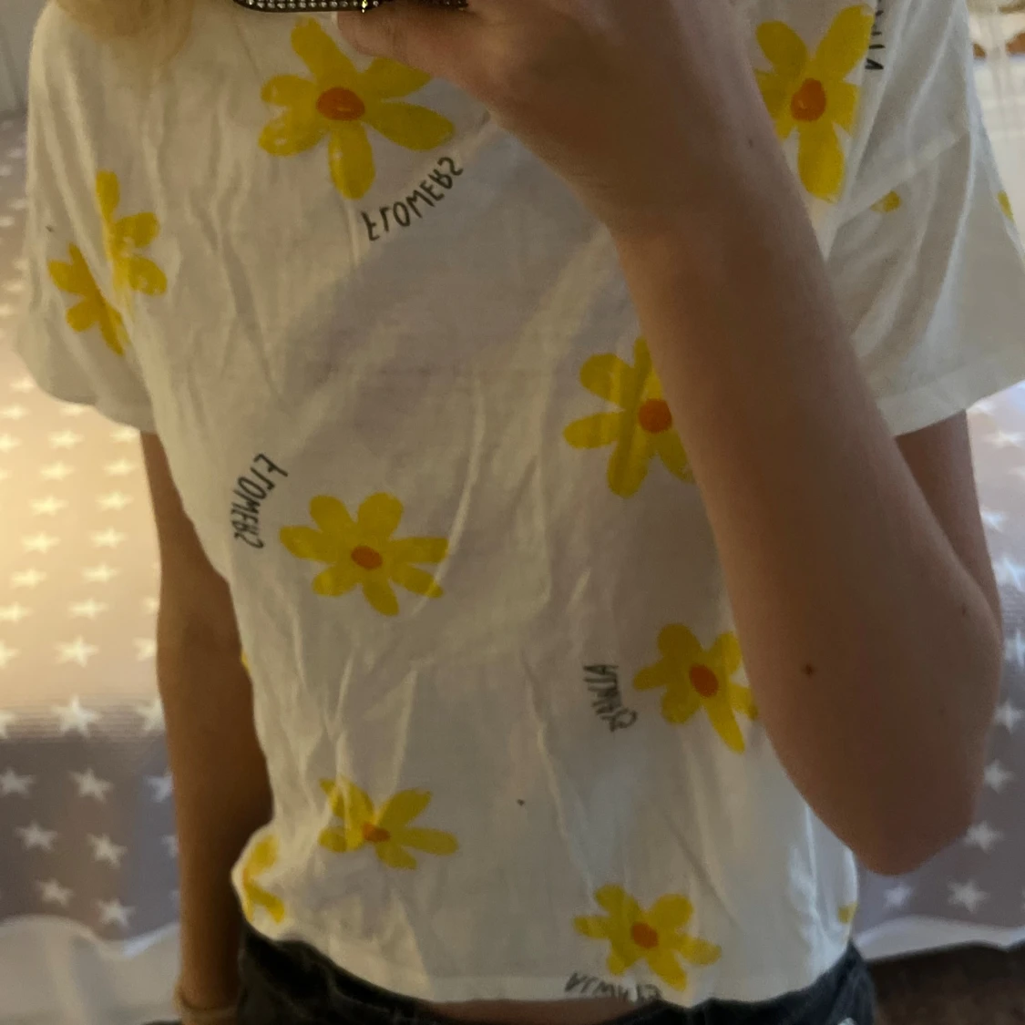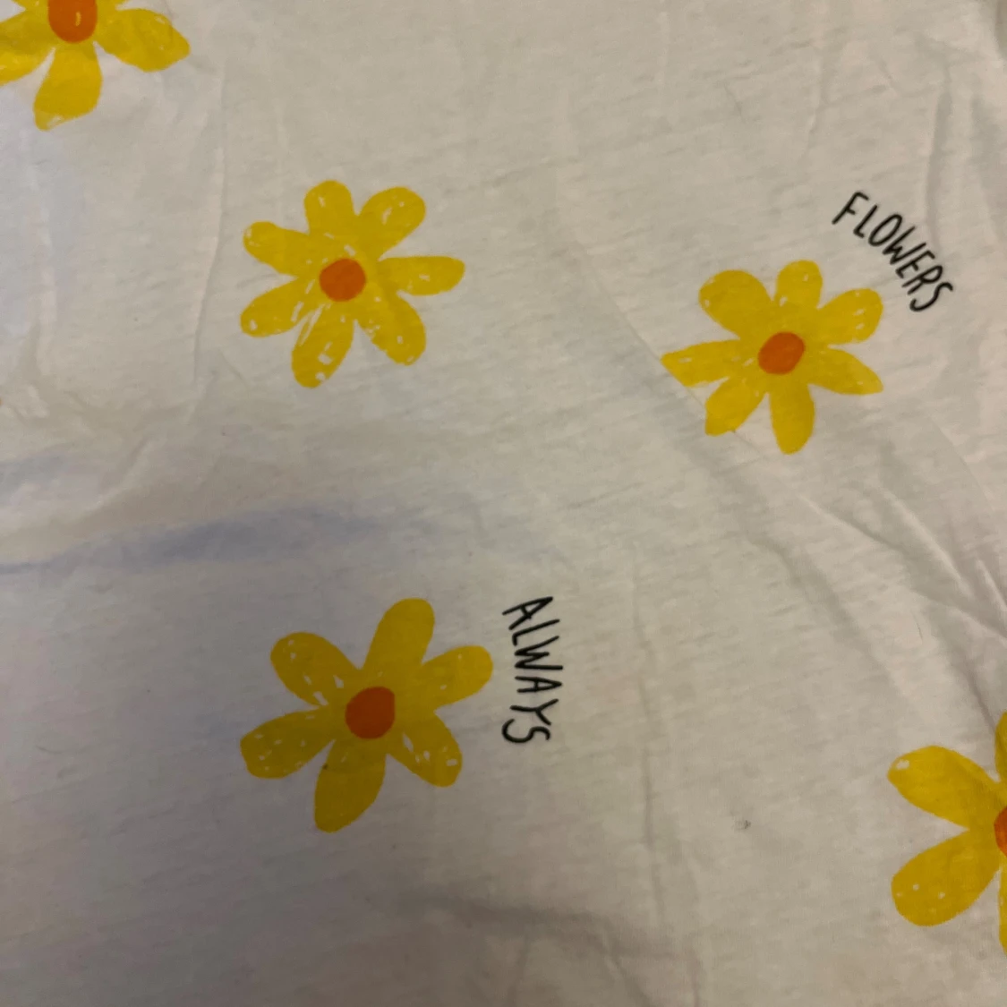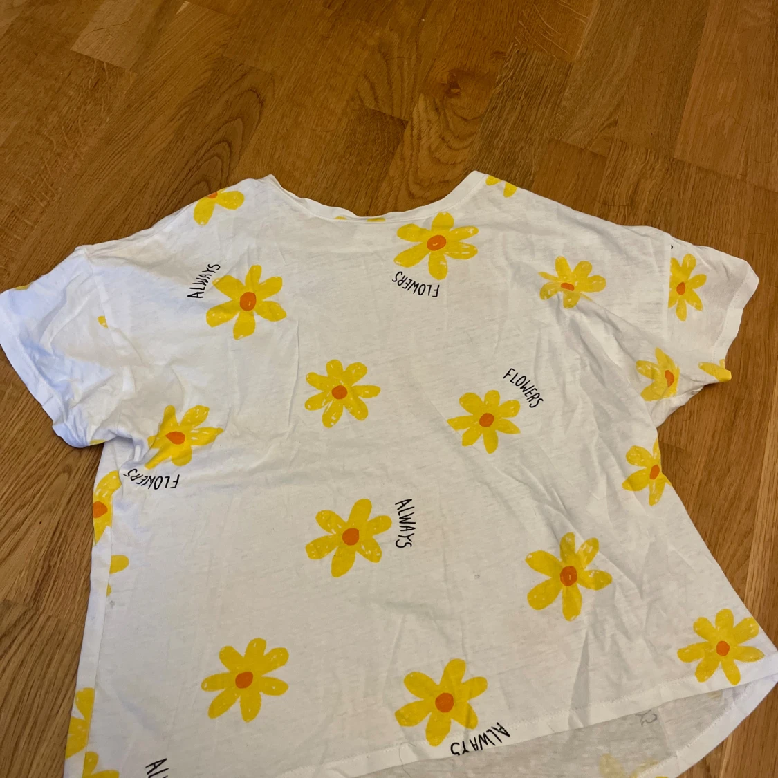 Vit topp med kort ärm och löst passform. Tryckta gula blommor med orange mitt över hela. Är i stl 152 men passar mig som har xs-s, köpt på ZARA. Säljer pga att den inte kommer till användning. Den har två små hål, men de syns inte. Hör av er om frågor och tveka inte med prisförslag!❤️