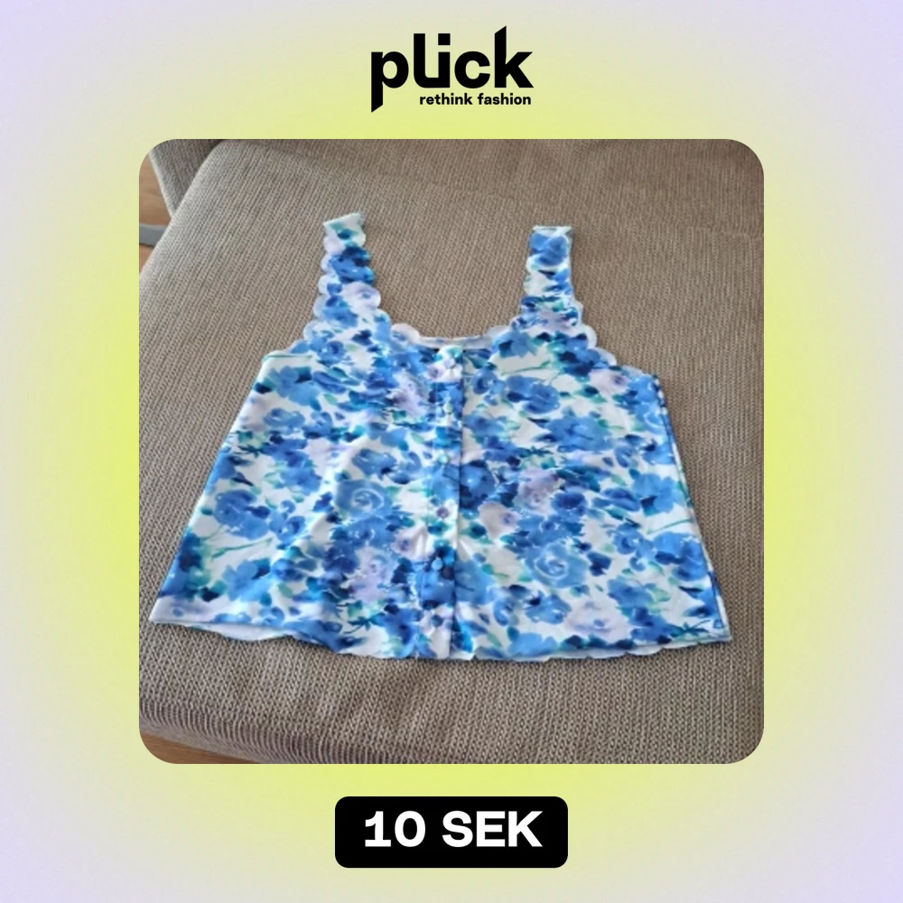En blommig linnetopp med blå och vita nyanser. Toppen har breda axelband och knappar framtill. Den har en vågig kantdesign längs axelbanden och halsringningen.