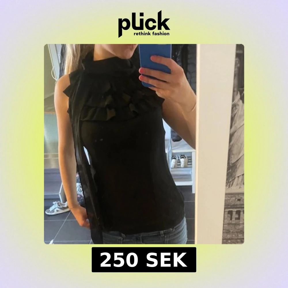 Snygg svart blus med hög hals, volangdetaljer framtill och ett långt knytband vid halsen. Ärmlös modell som passar perfekt till jeans eller kjol. Stilren och trendig design.