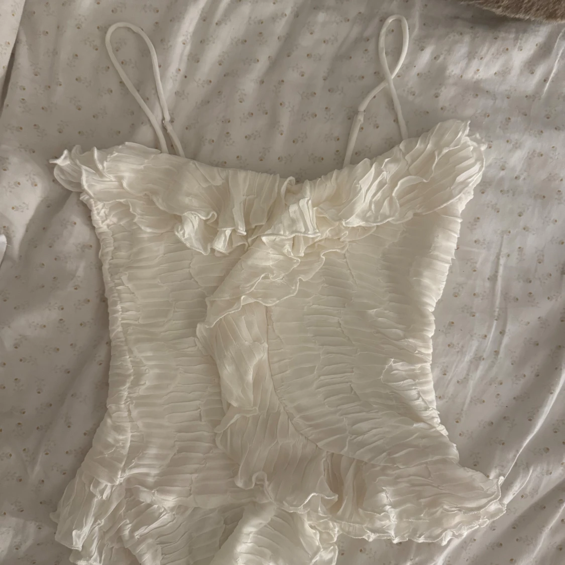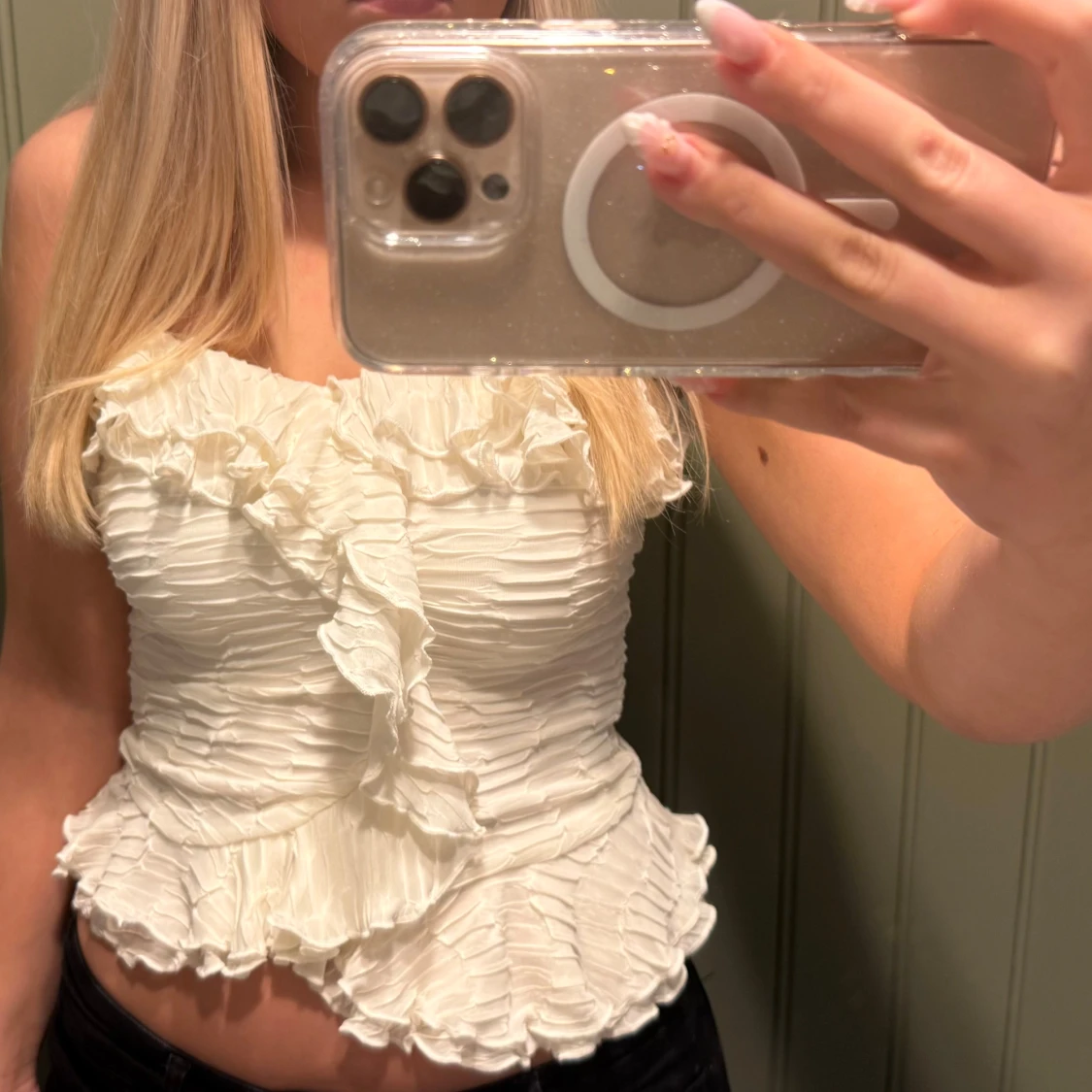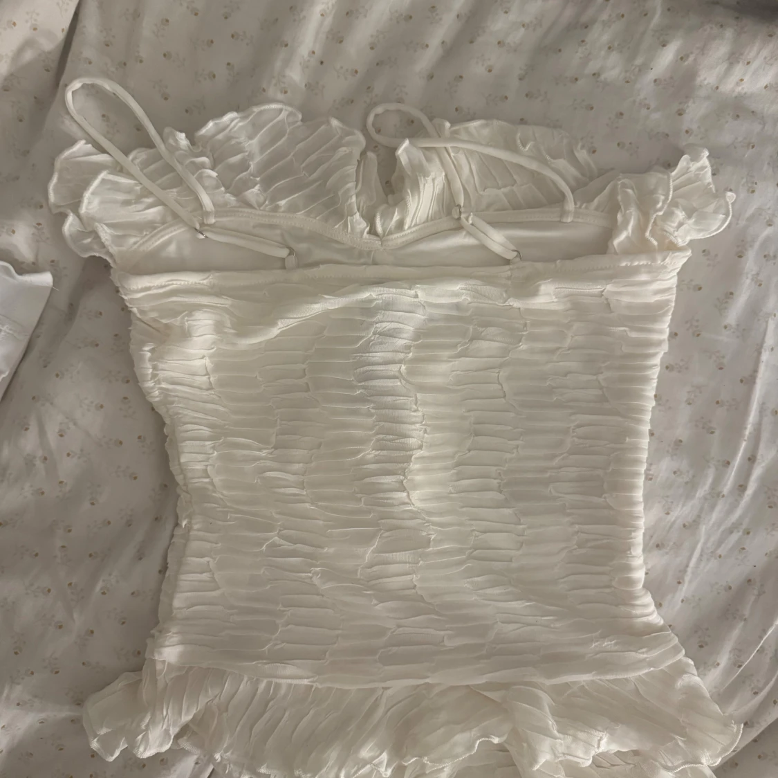 Supersöt vit linnetopp med tunna axelband och volangdetaljer både upptill och nertill. Aldrig använd med prislappen kvar!