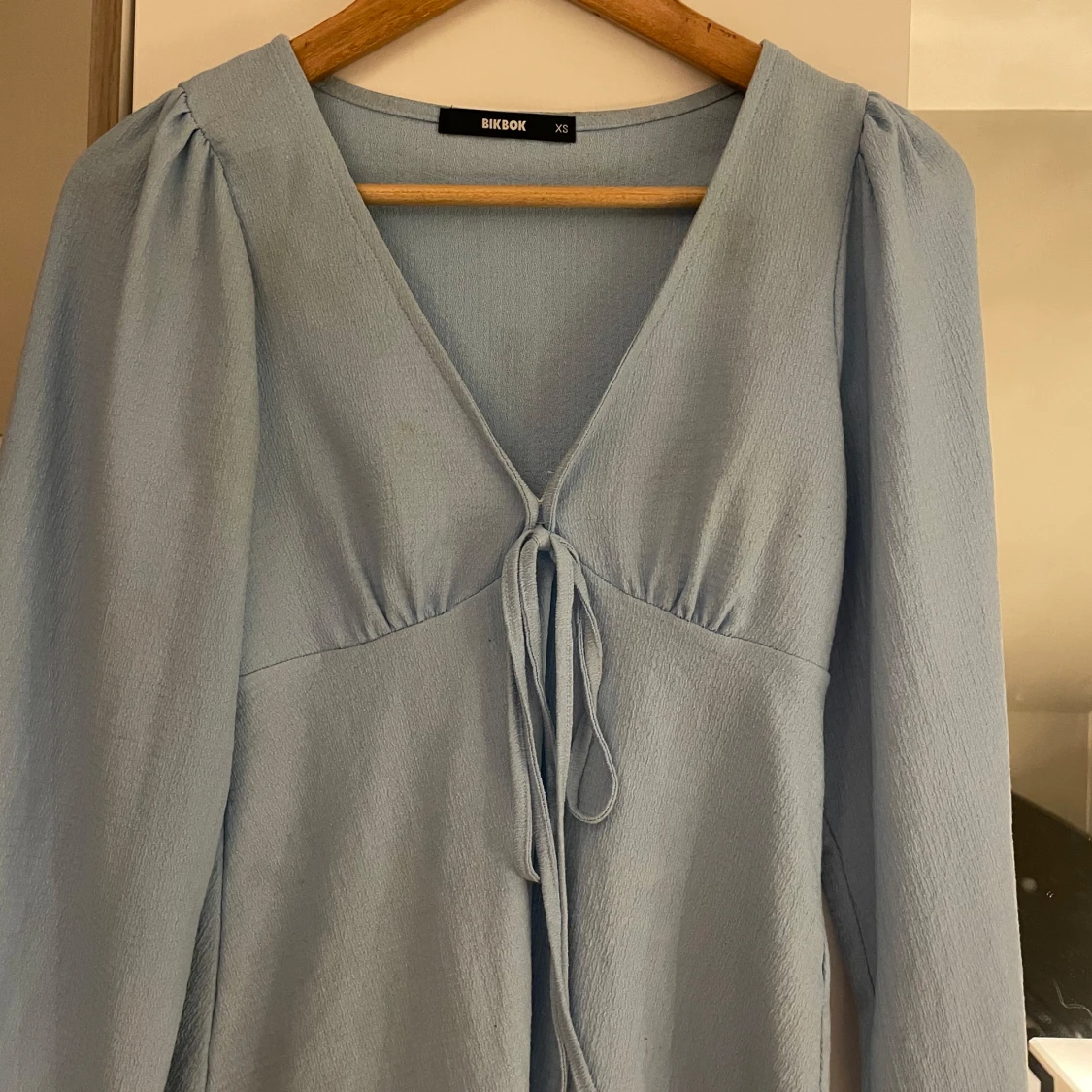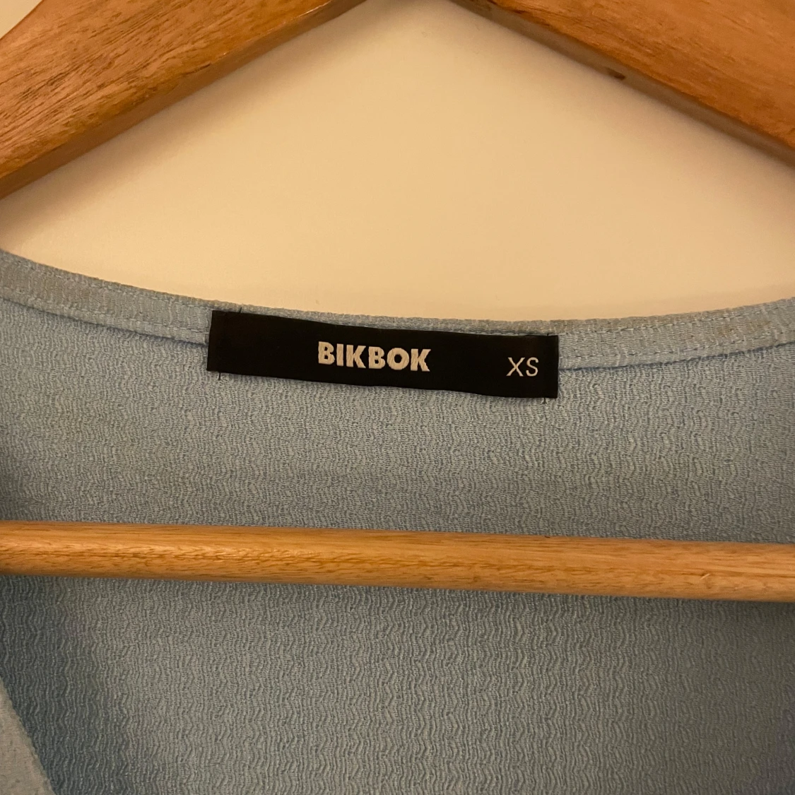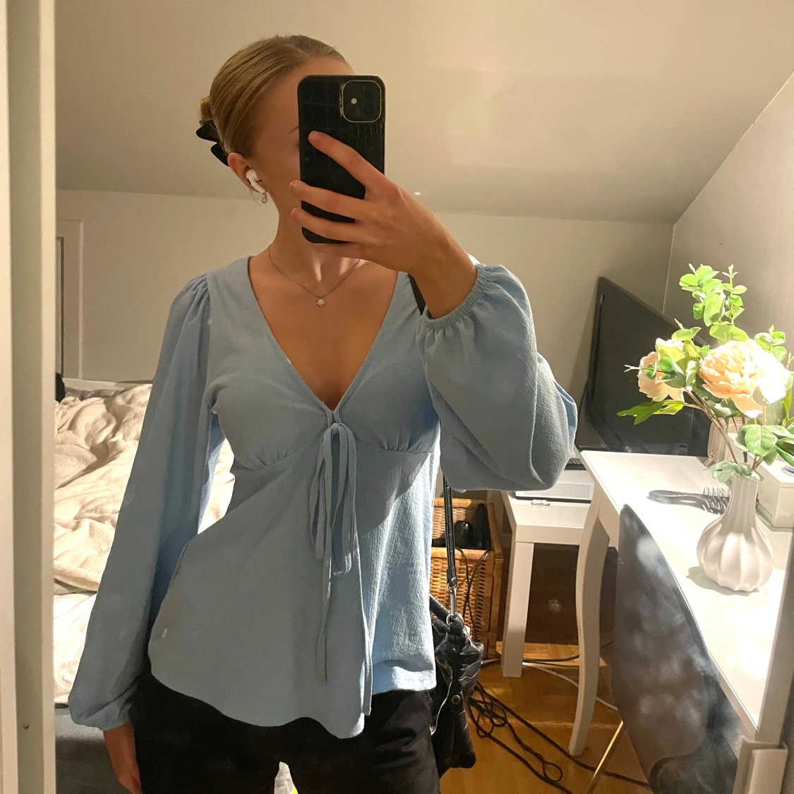 Superfin ljusblå blus från BikBok med knytning framtill och långa ärmar i mycket bra skick💕