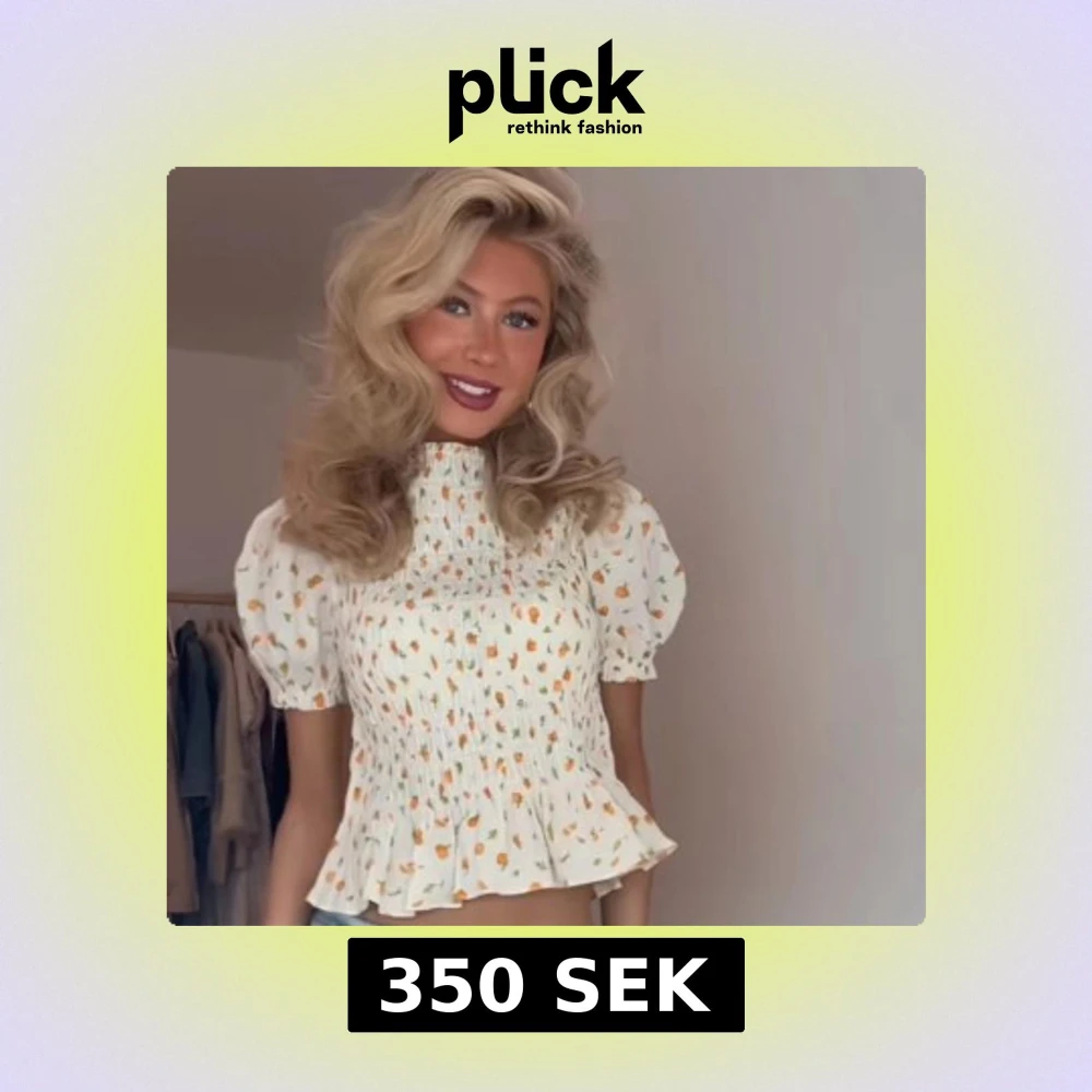 Supersöt slutsåld vit blus med apelsiner på 🍊🍊Blusen har puffärmar, smock över bröstet och volang nertill. Perfekt för en somrig look och passar till både jeans och kjol.