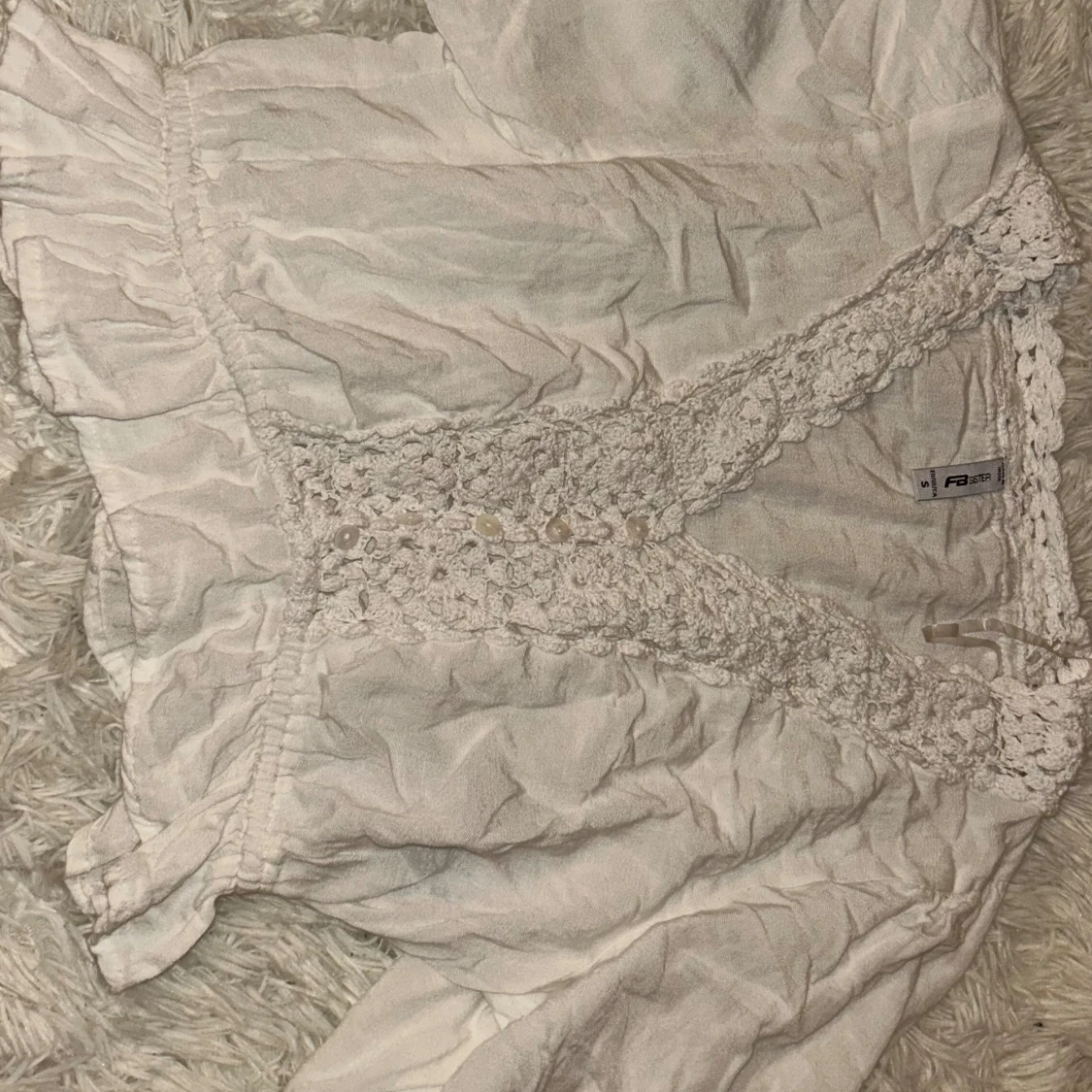 Superfin vit blus från F.A.S med virkade spetsdetaljer och pärlknappar längs v-ringningen. Blusen har vida, långa ärmar och resår i midjan för en croppad look.