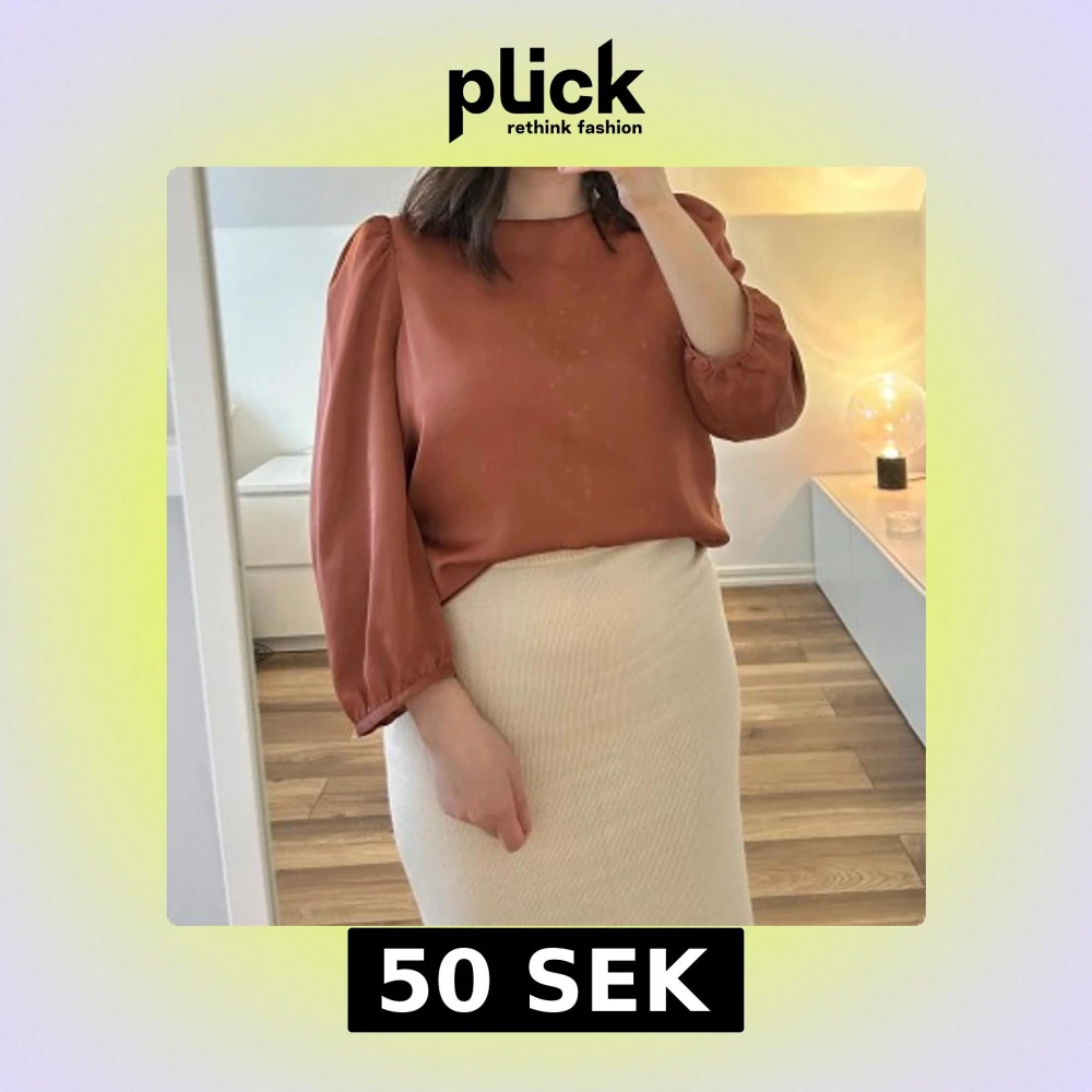 Säljer en blus med puffärmar och rund halsringning. Blusen har en elegant, slät yta och är tillverkad i ett lätt glansigt material som ger en lyxig känsla. Har en fläck (bild 4) som en steamer lämnat efter sig, syns dock inte när den är instoppad.