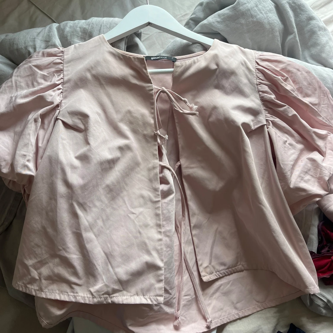 Supersöt ljusrosa blus från Gina Tricot med puffiga ärmar och knyt framtill. Blusen har en rak passform och är tillverkad i mjuk bomull. Perfekt för dig som gillar romantiska detaljer och en feminin look.