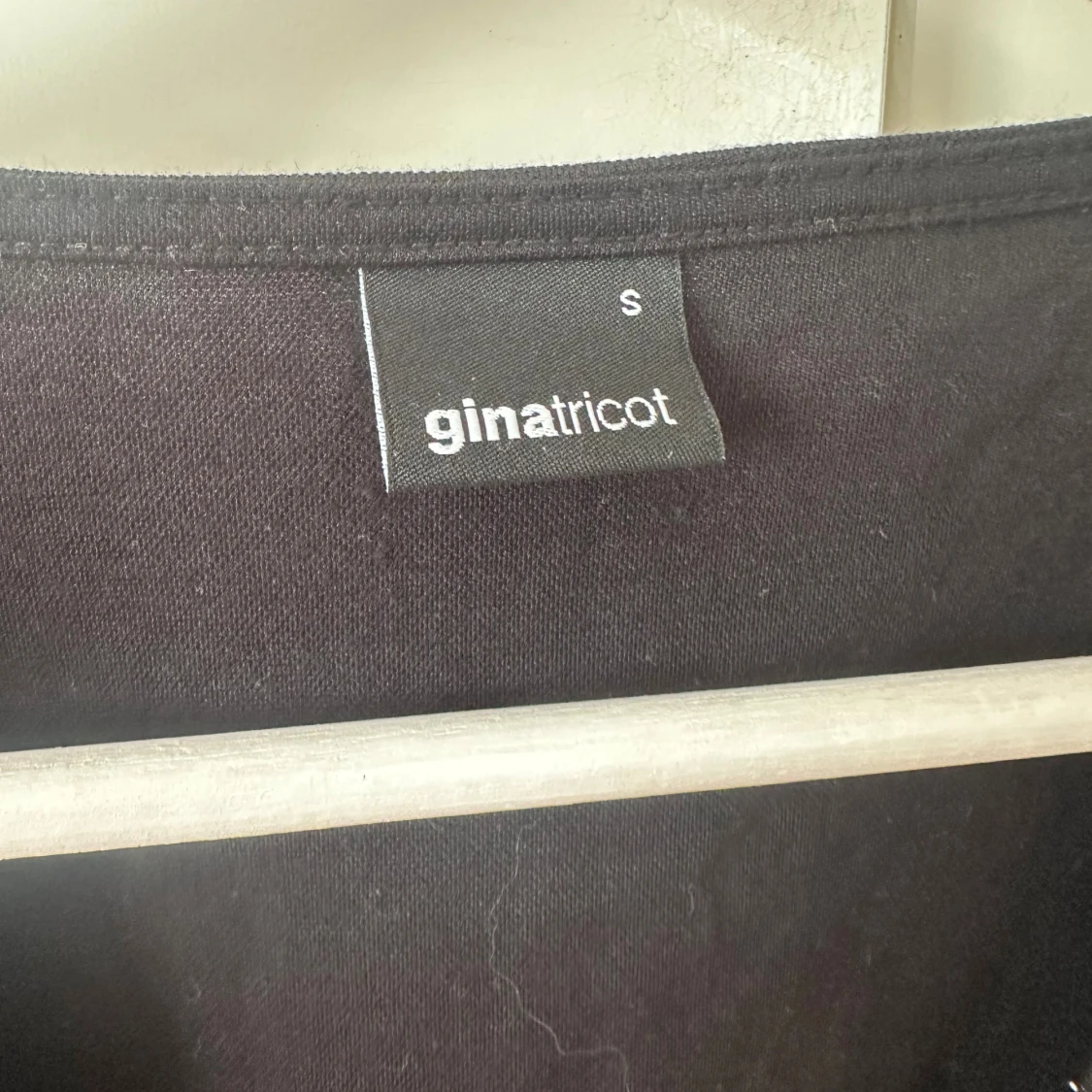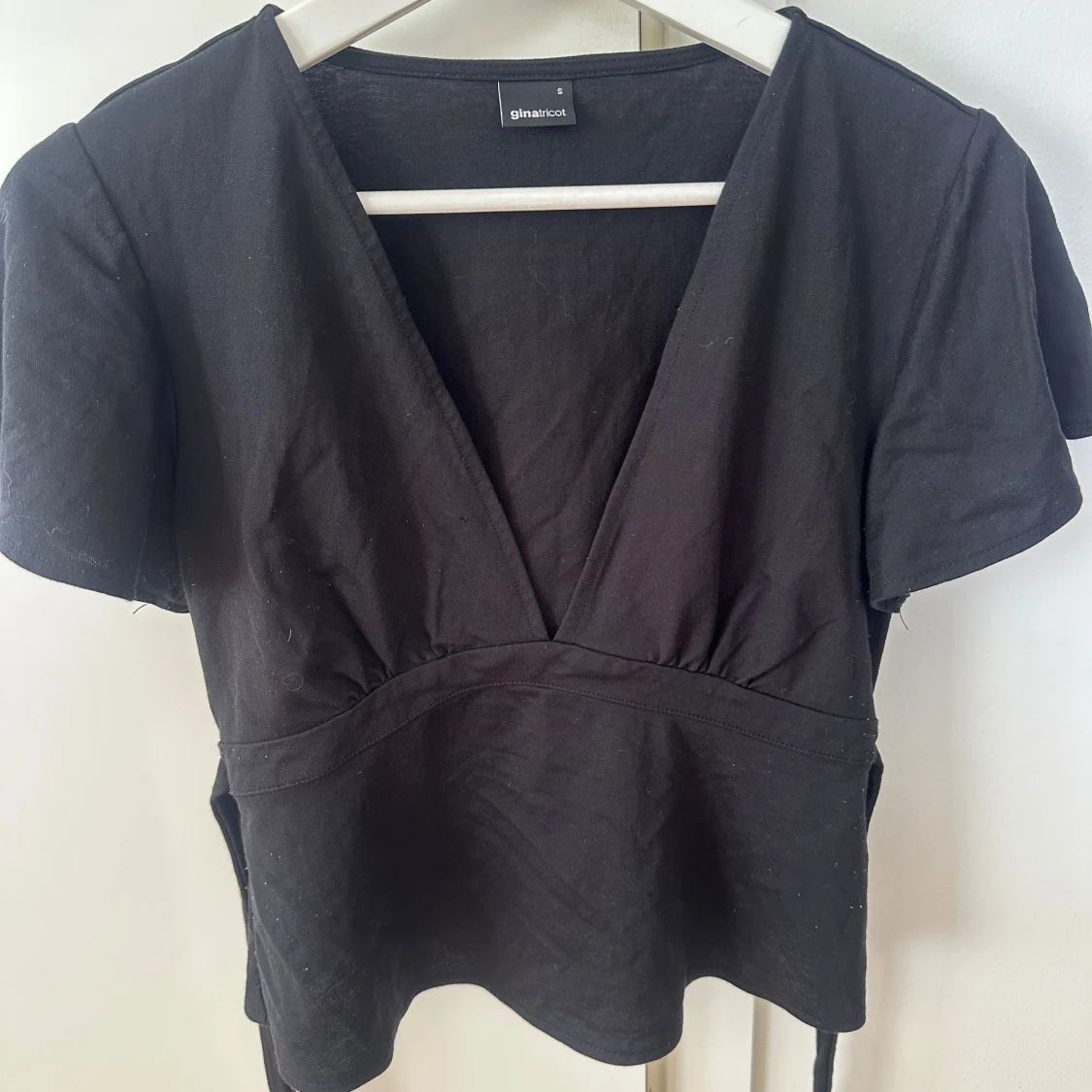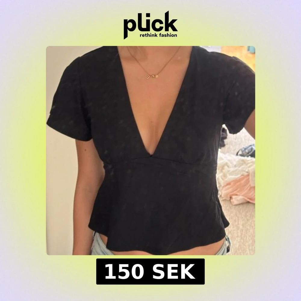 Svart topp från Gina Tricot i storlek S med djup v-ringning och korta ärmar. Modellen har en markerad söm under bysten och lätt utsvängd nederdel. Tillverkad i mjuk bomull, perfekt för en trendig och enkel look.