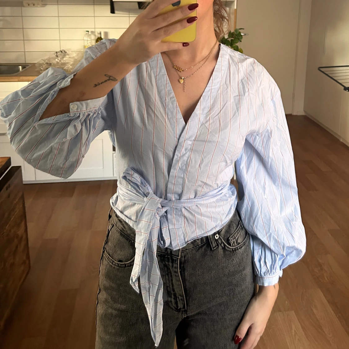 Säljer en ljusblå omlottblus med tunna röda ränder. Blusen har v-ringning, knyt i midjan och ballongärmar med knapp vid ärmslut. 💓💓