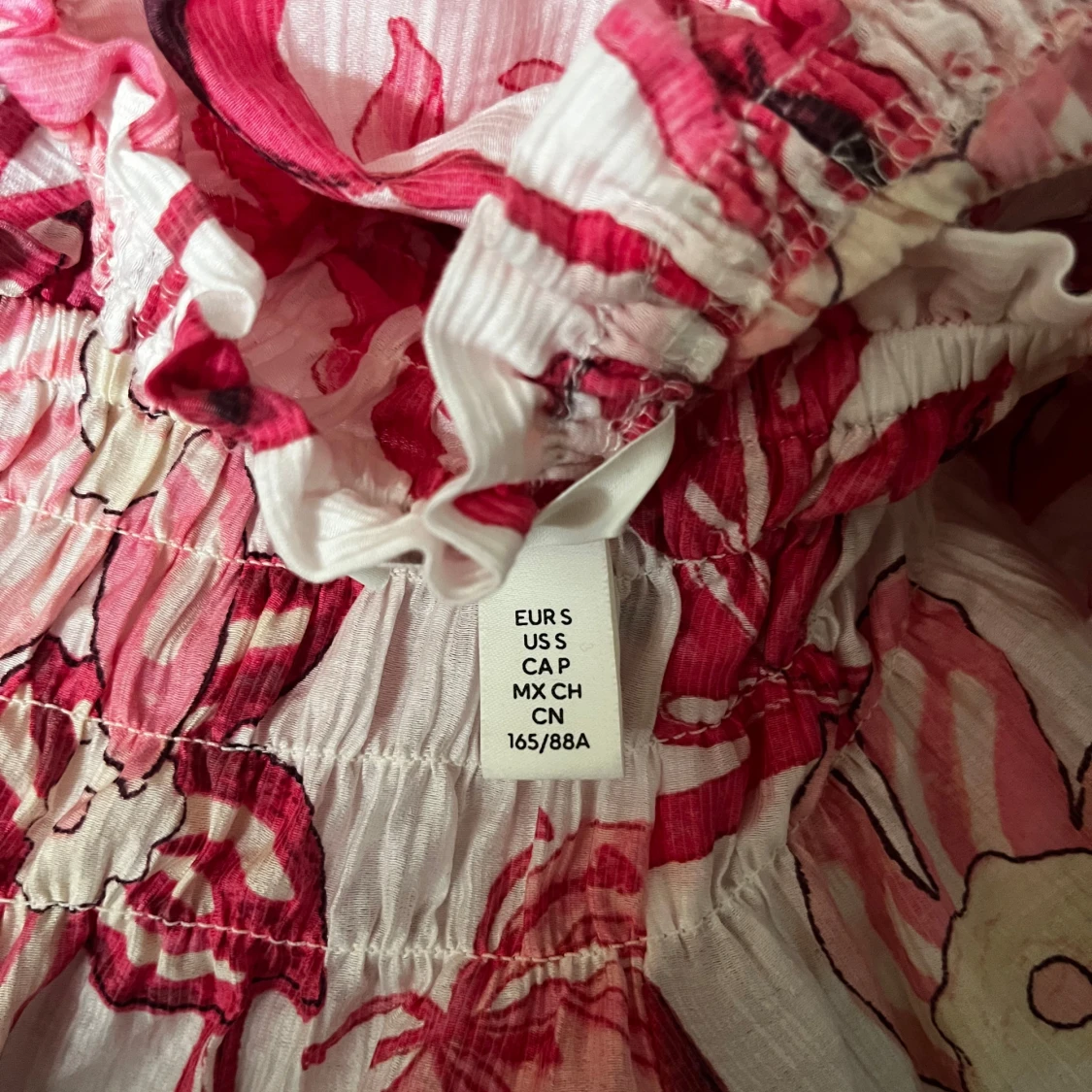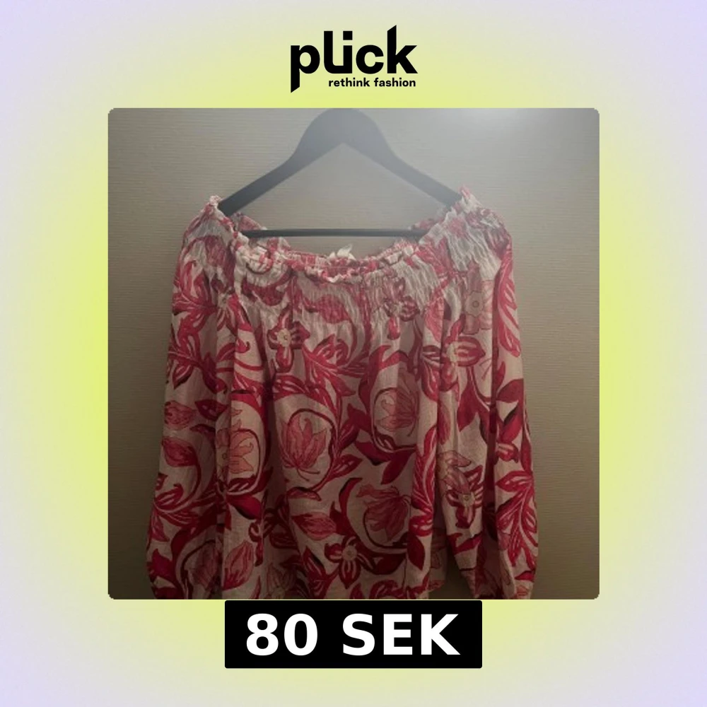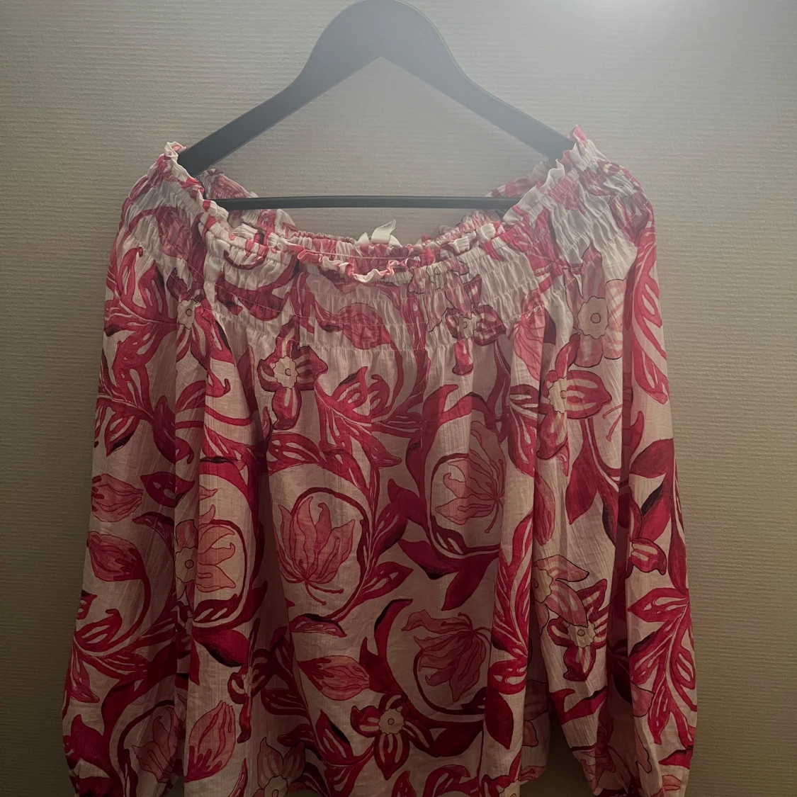 Supersöt blommig blus med offshoulder-modell i vitt och rosa. Lätt och luftig med resår upptill och långa ärmar. Perfekt för sommaren🩷🩷🩷
