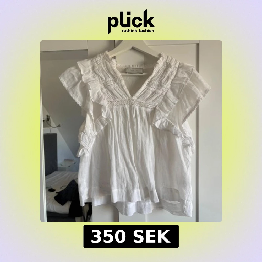 Säljer en söt vit blus från Neo Noir med volangdetaljer och korta ärmar. Blusen har en luftig passform och är perfekt för varma dagar. Den har en vacker struktur och är tillverkad i ett lätt material.