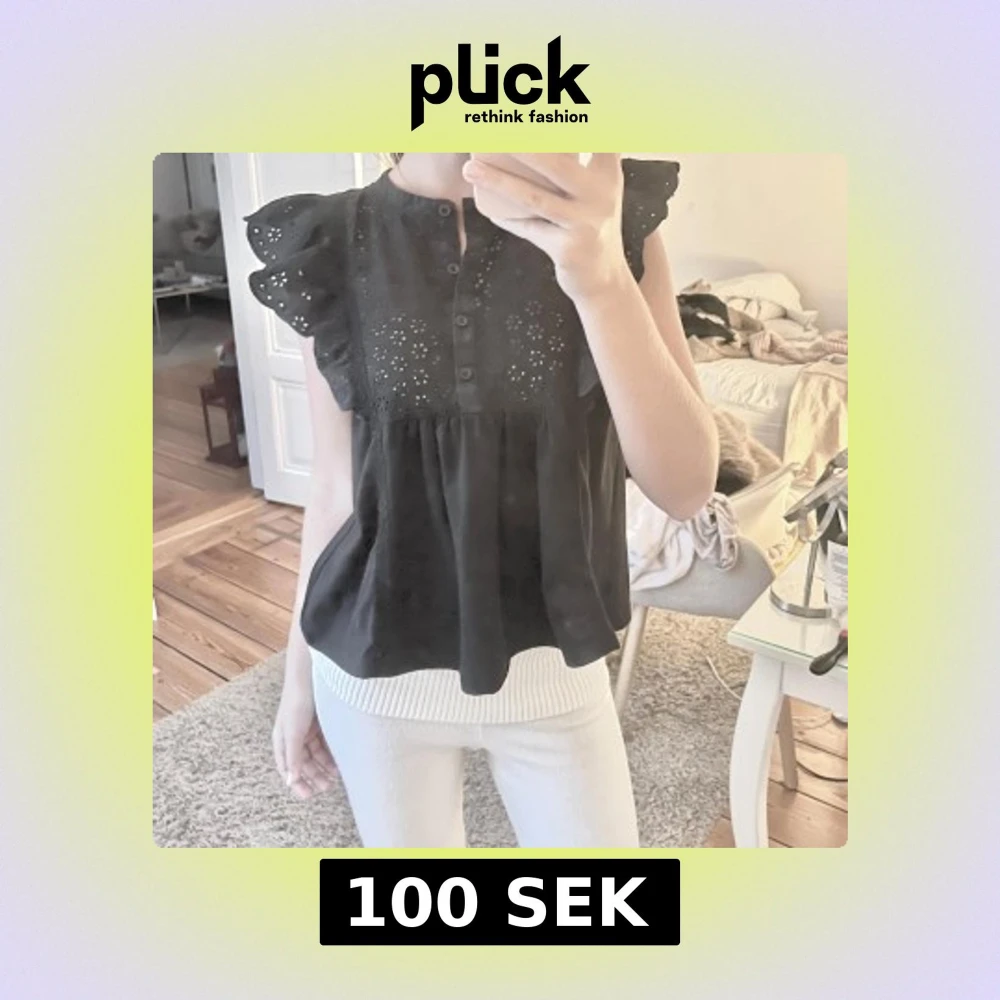 Säljer en söt svart blus med spetsdetaljer och volangärmar. Blusen har knappar framtill och en luftig passform, perfekt för både vardag och festliga tillfällen.