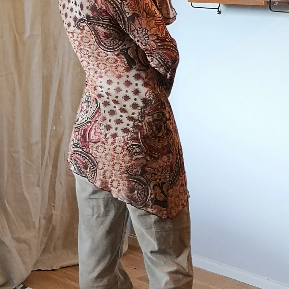 Superfin lång blus/tunika med sammetsdetalj på bröstet. Jag är 160 och har storlek S/M.