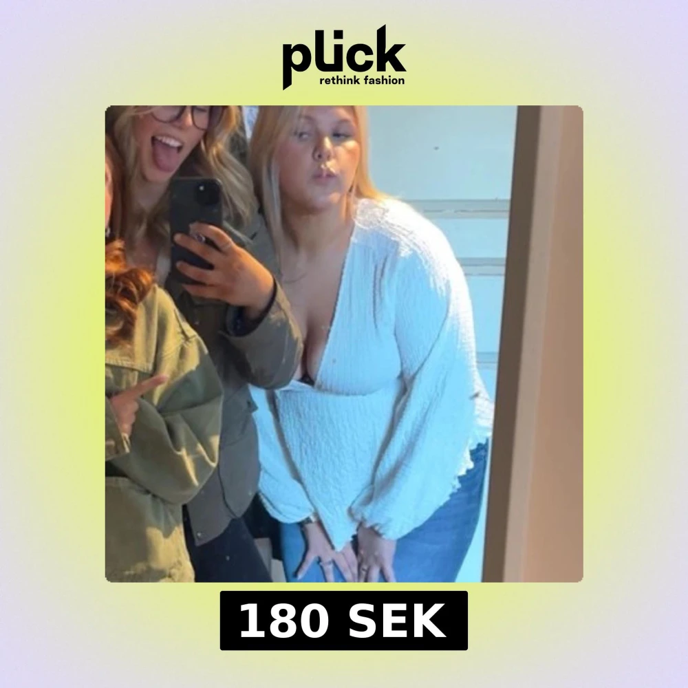 Säljer en vit omlottopp med lång ärm och v-ringning. Toppen har en snygg knytning i nacken och är gjord i ett krinklat, lätt material. Kommer inte till användning och använda bara några gånger, strl 46 men passar med som en 44💕