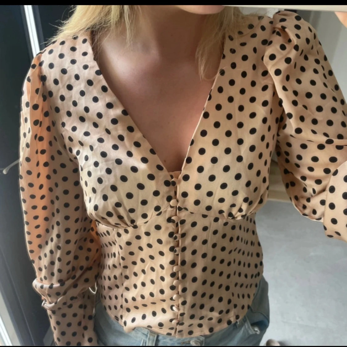 Supersnygg beige blus med svarta prickar och v-ringning. Så gott som i nytt skick.