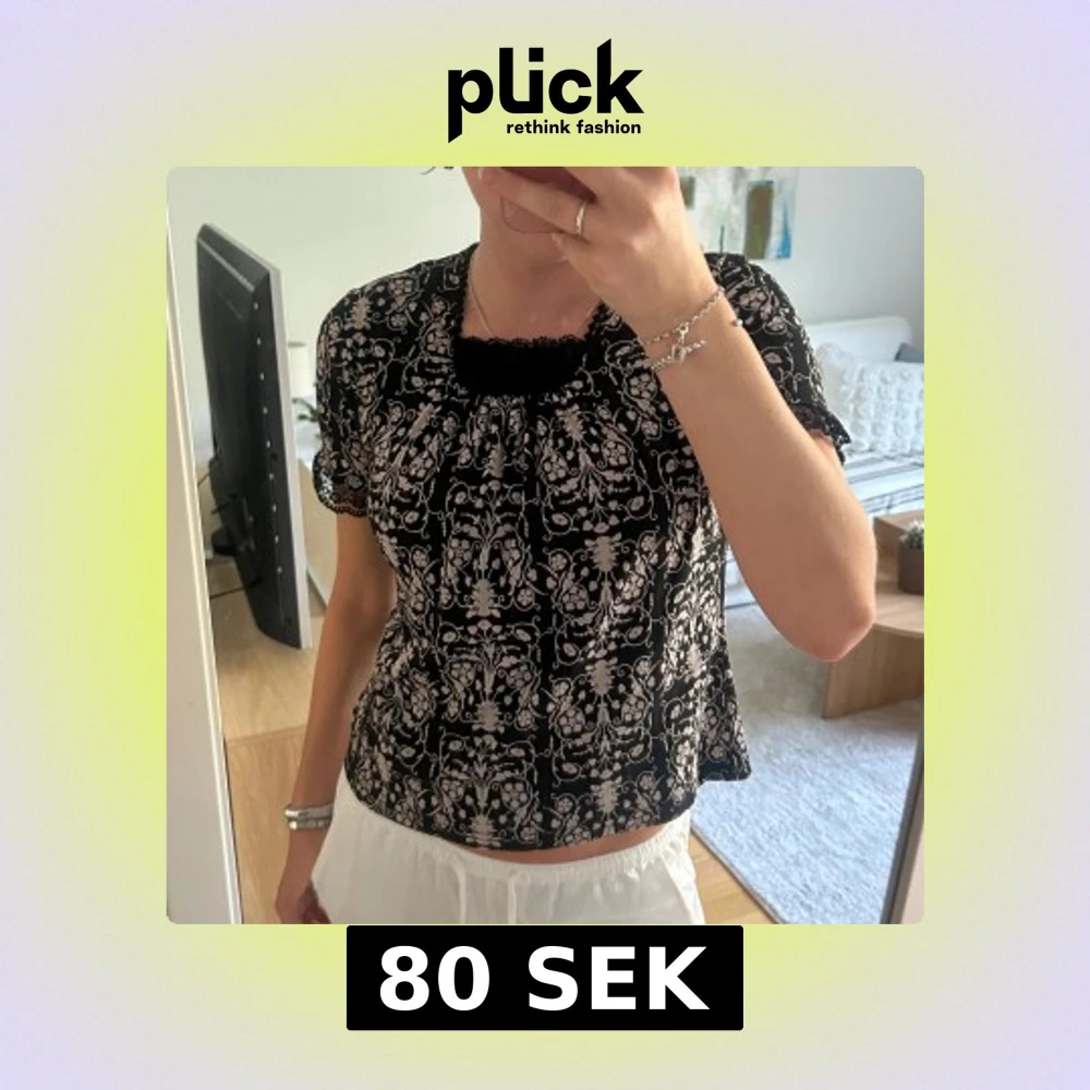 Säljer en svart blus från Sanline med ljusa blommiga mönster och spetsdetaljer vid halsringning och ärmslut. Blusen har korta ärmar och en loose passform, perfekt för dig som gillar romantiska vibes och snygga detaljer.
