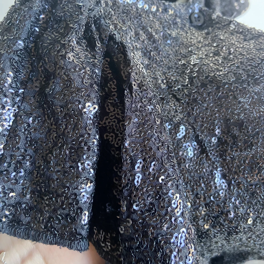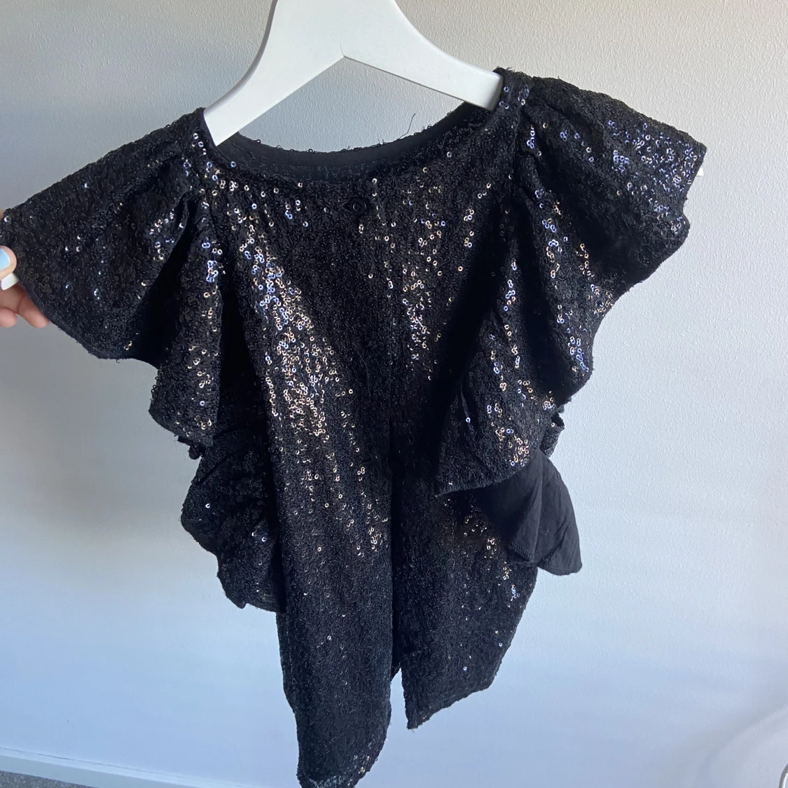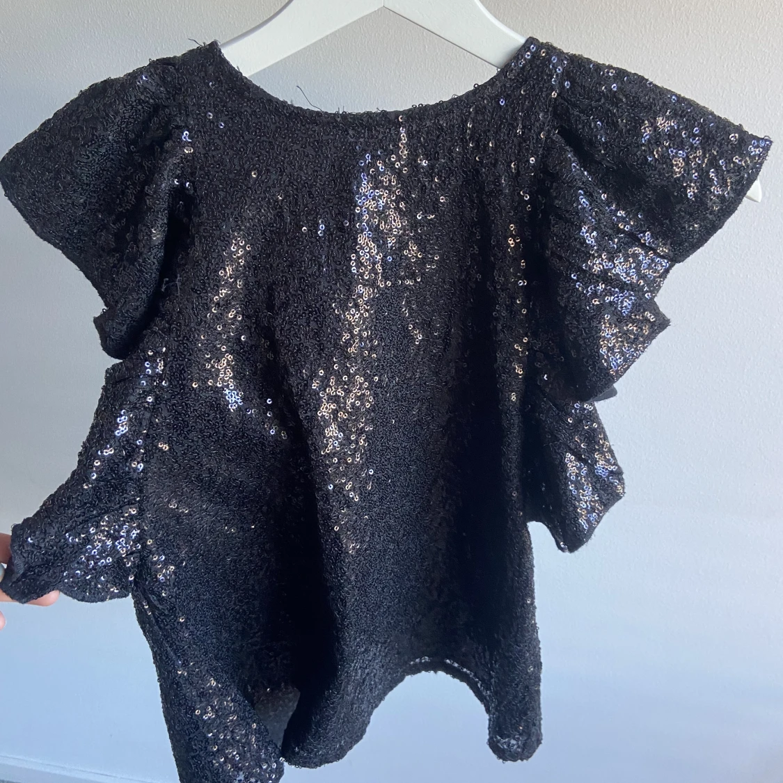Svart topp med paljetter. Volang ärmar. Storleken är 14 år men passar en XS. Fint skick.