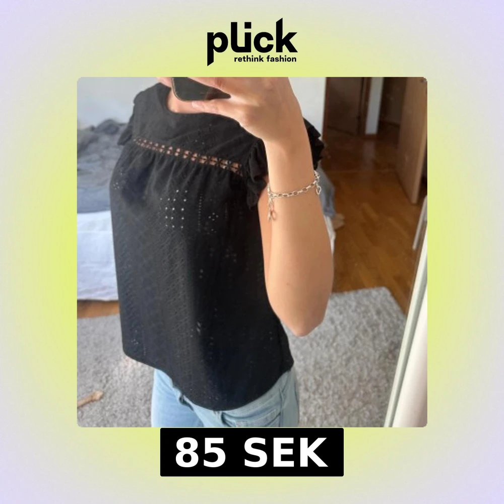 Svart blus i bomull med broderade hålmönster och spetsdetalj över bröstet. Modellen har korta ärmar med volang och en lös passform. Perfekt att styla med jeans eller kjol för en chill look.