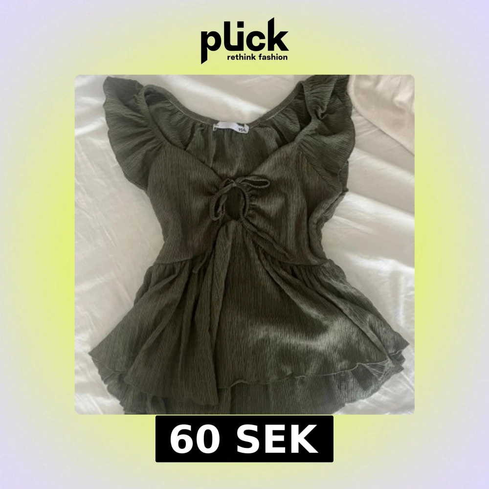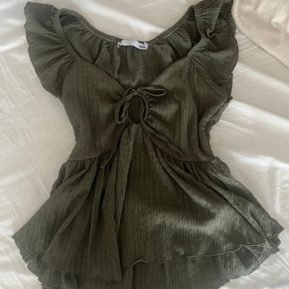 Supersöt olivgrön topp med volangärmar och volangkant nertill. Toppen har knytning framtill och en lätt rynkad struktur i tyget. Perfekt för vår och sommar!