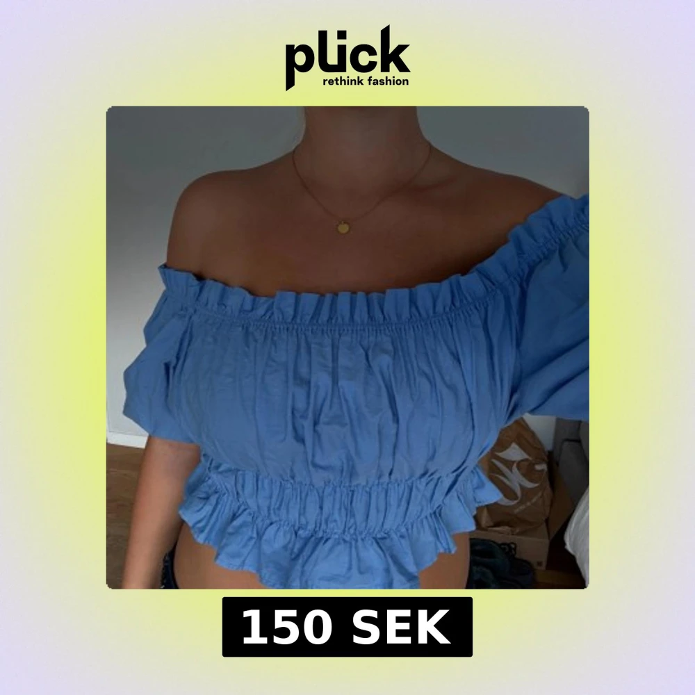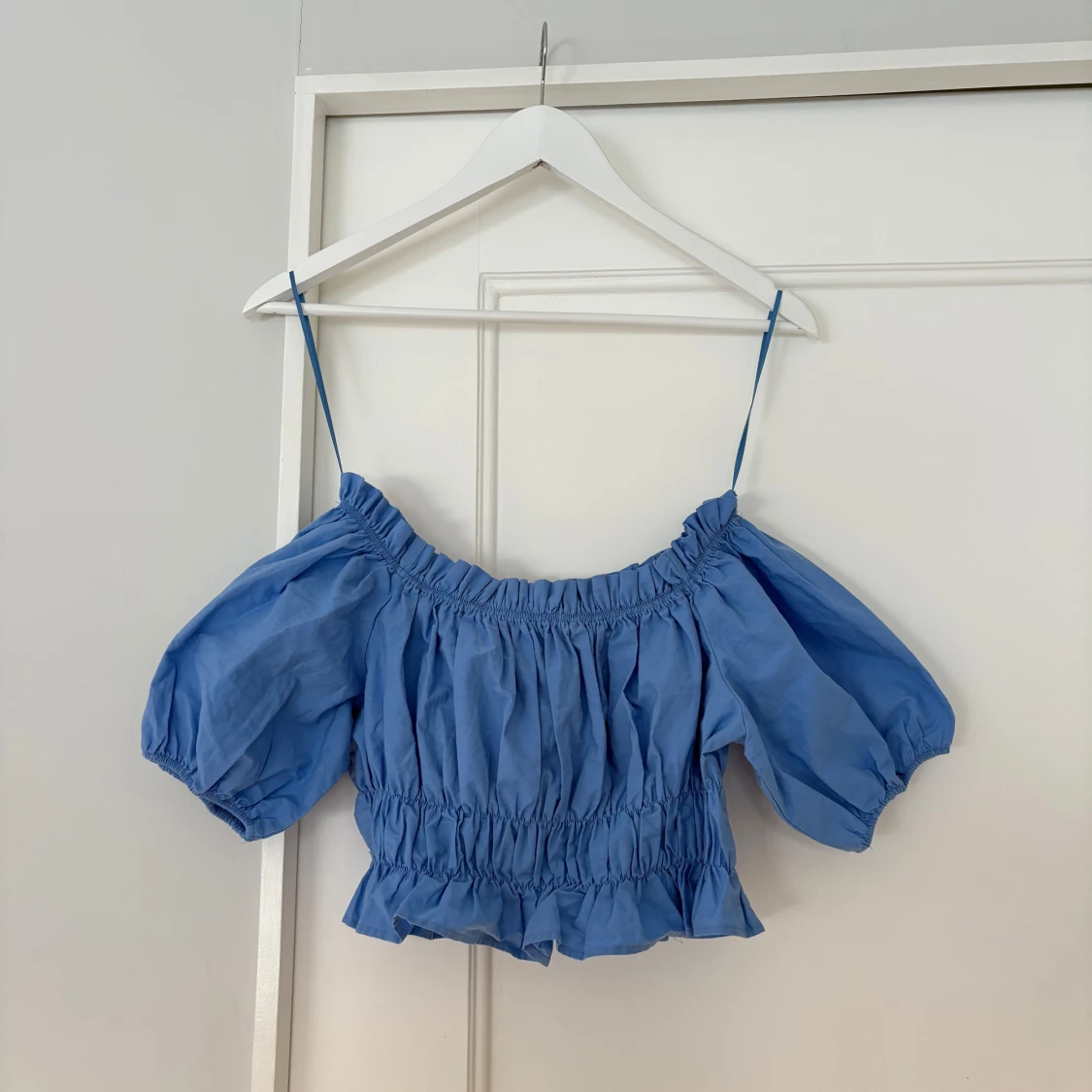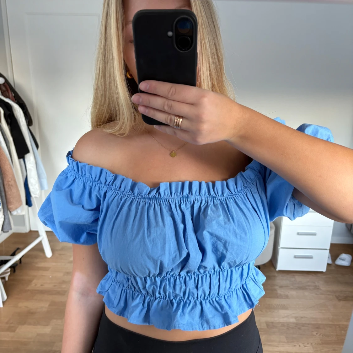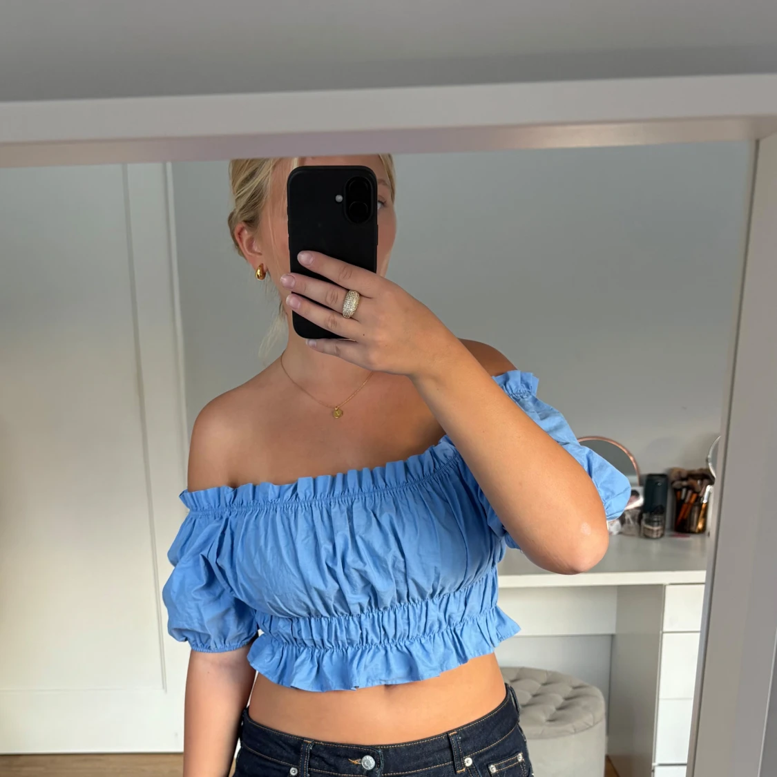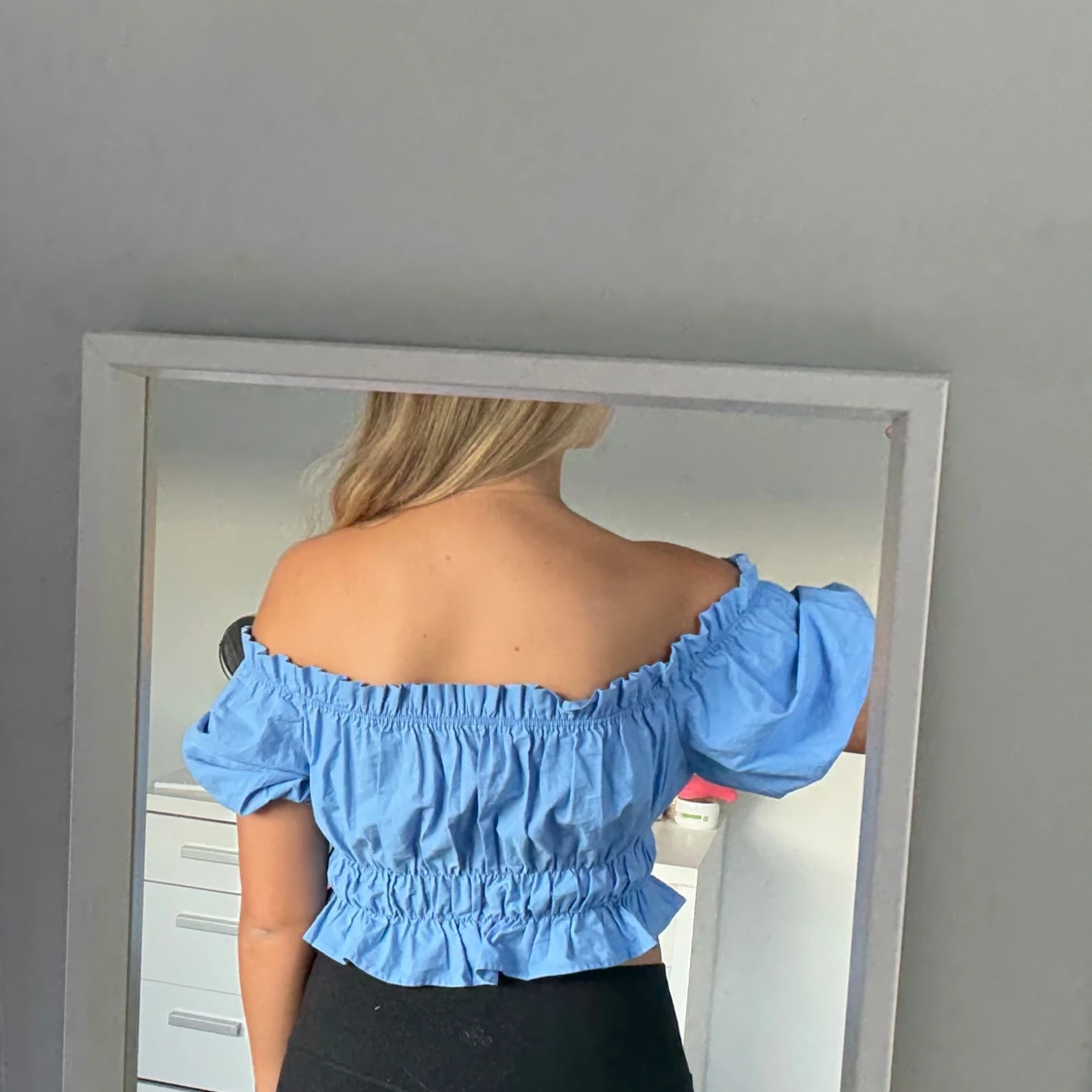 Supersöt blå offshoulder blus med puffiga korta ärmar. Toppen har resår vid axlar och midja för en snygg passform och är croppad. Från Zara i storlek s, endast använd 1 gång.