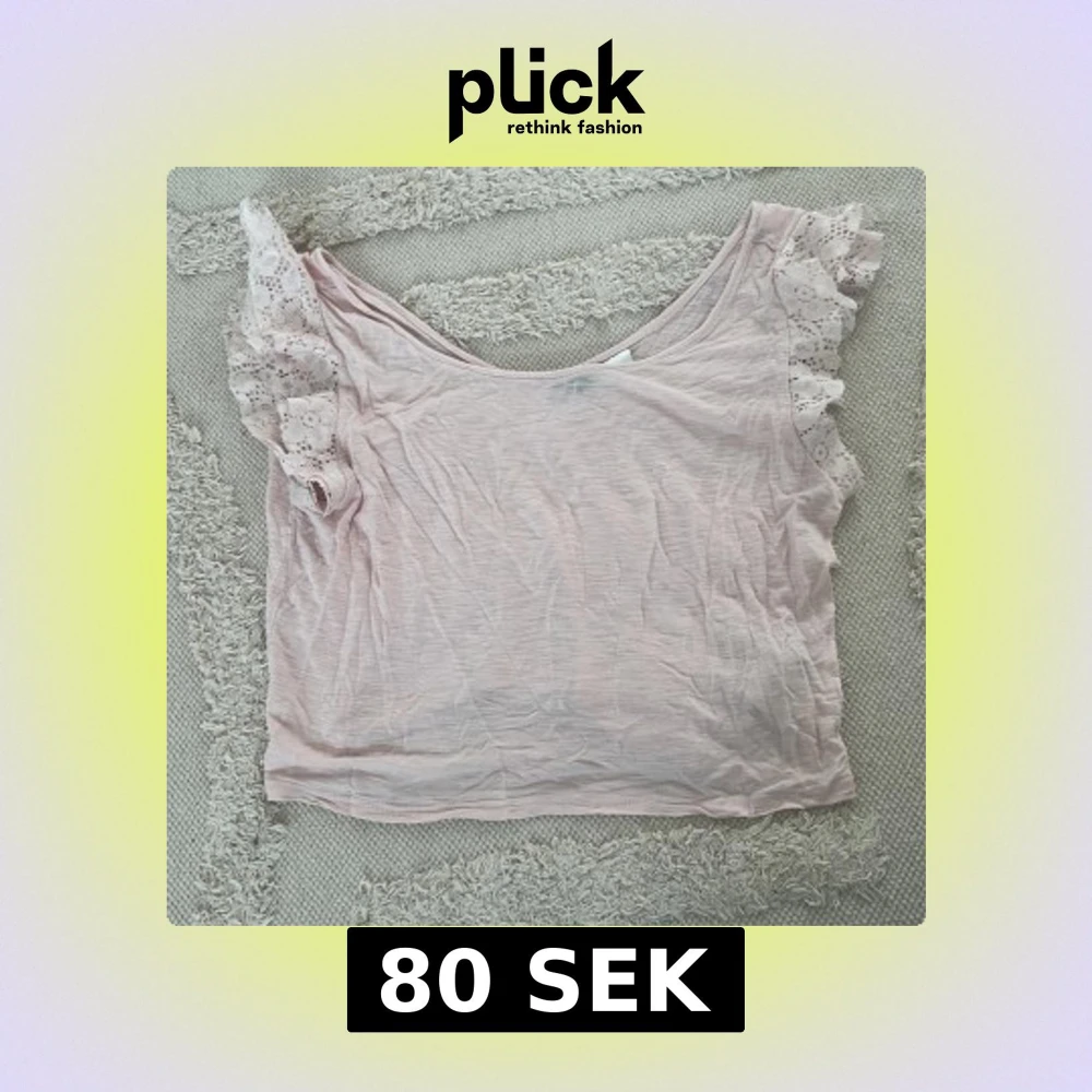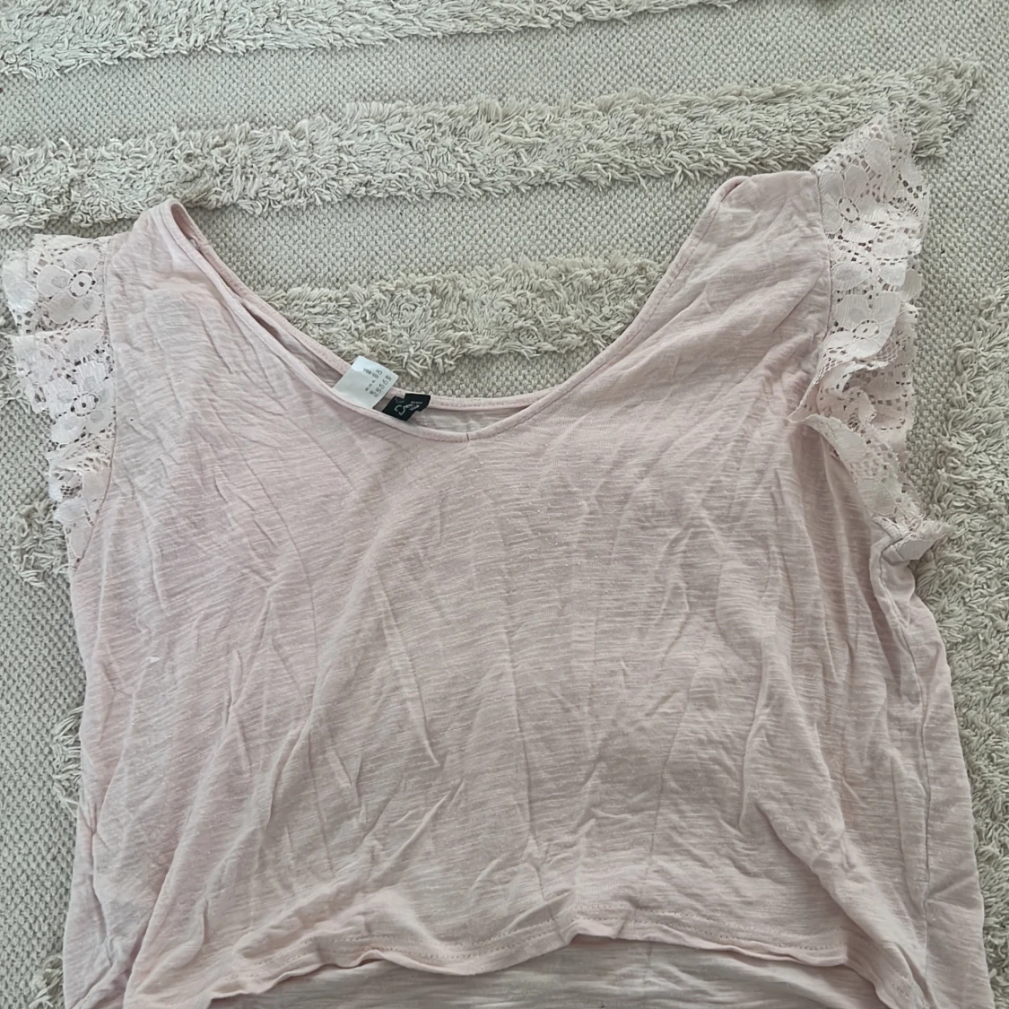 Supersöt ljusrosa topp från H&M Divided i storlek S. Toppen har korta ärmar med volangig spetsdetalj och en lös, luftig passform.