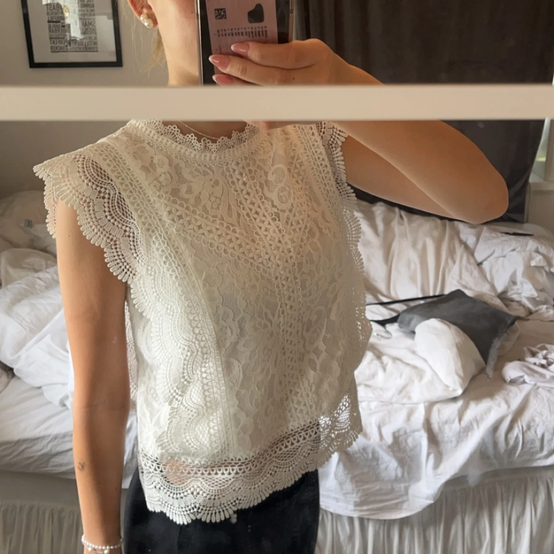 En elegant vit spetsblus med detaljerade spetsmönster och volangkant vid ärmslut och nederkant.