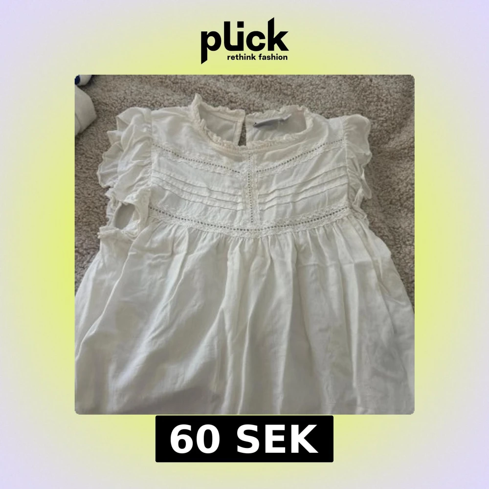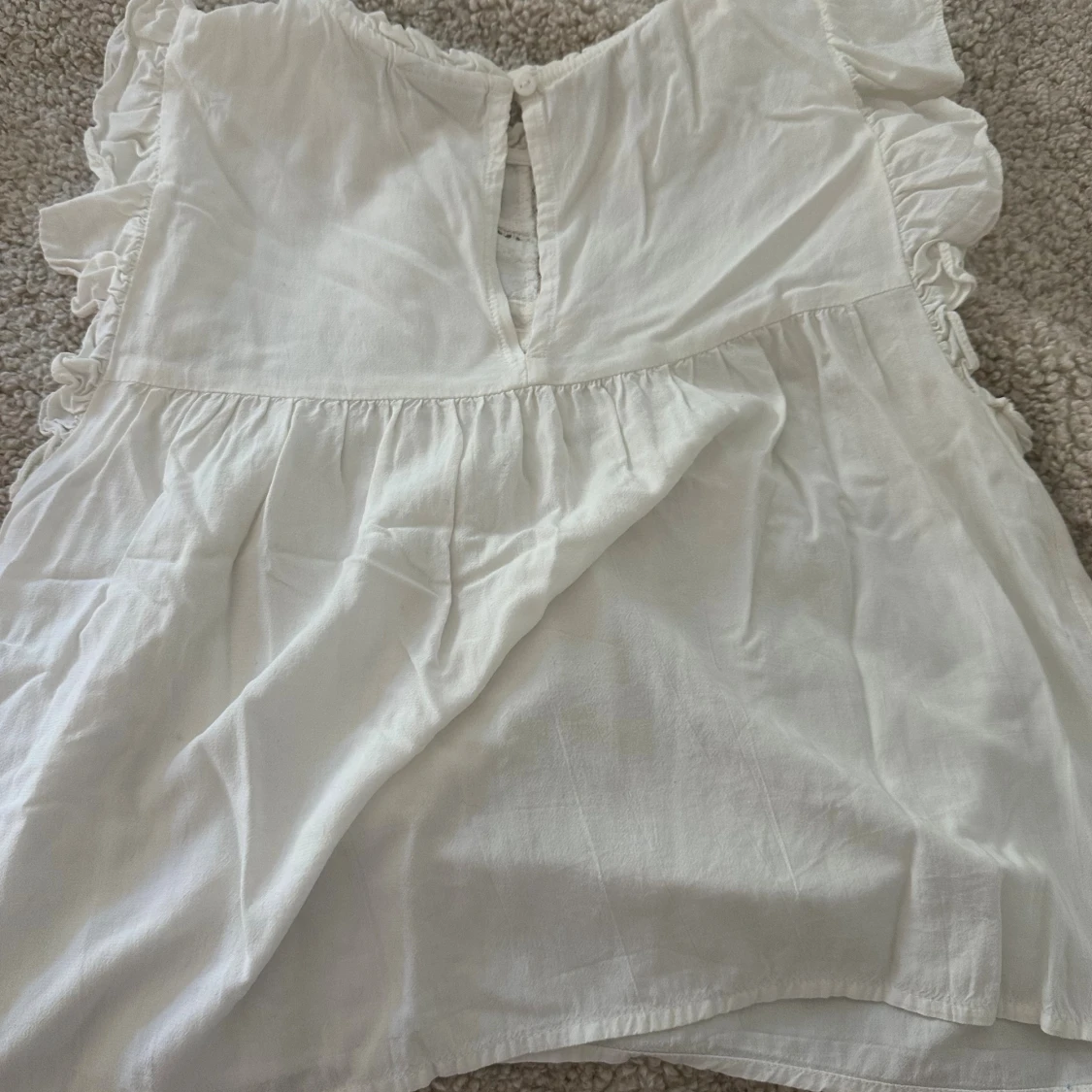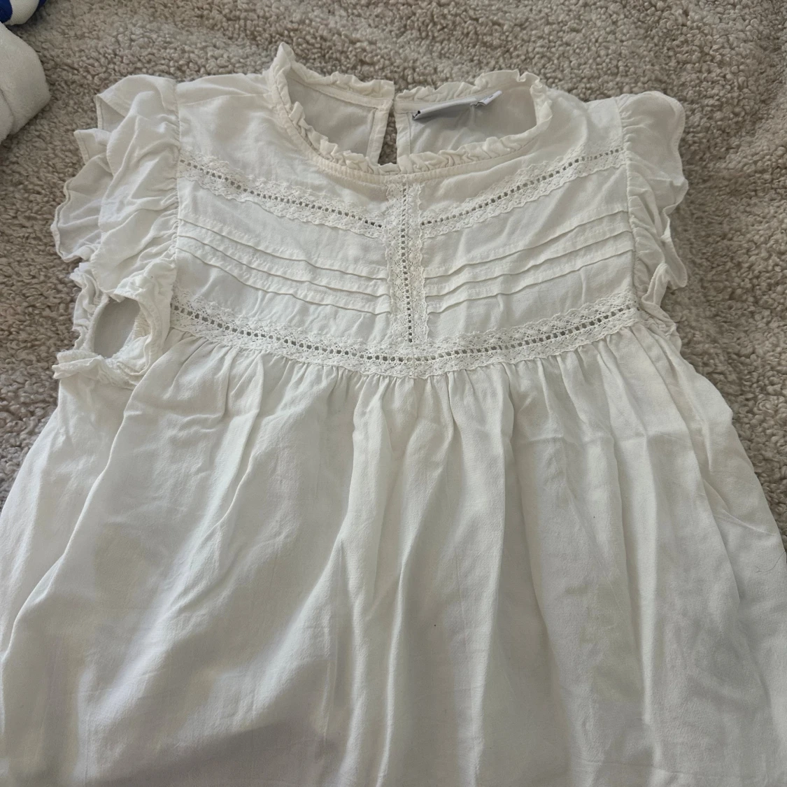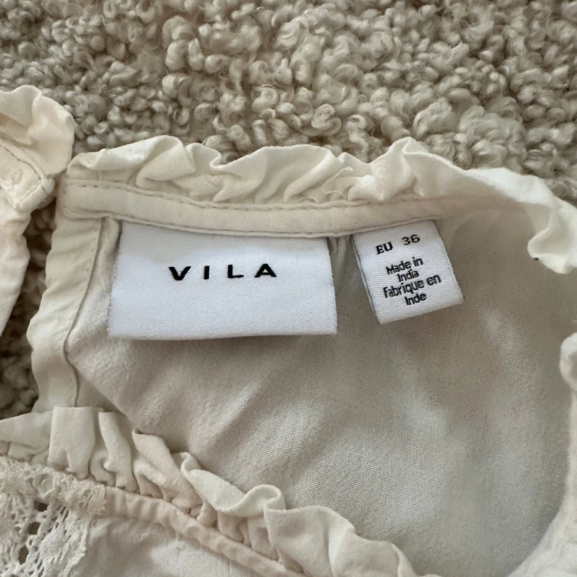 Supersöt vit blus från Vila med volangdetaljer vid ärmar och hals, spetsinslag och dekorativa sömmar framtill. Blusen är ärmlös och har en liten knapp i nacken. Använd fåtal gånger, tar frakt