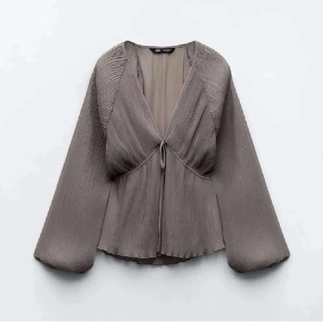 Snygg grå blus från Zara med v-ringning och knytning framtill. Använt en gång och säljer då jag tröttnat på den.
