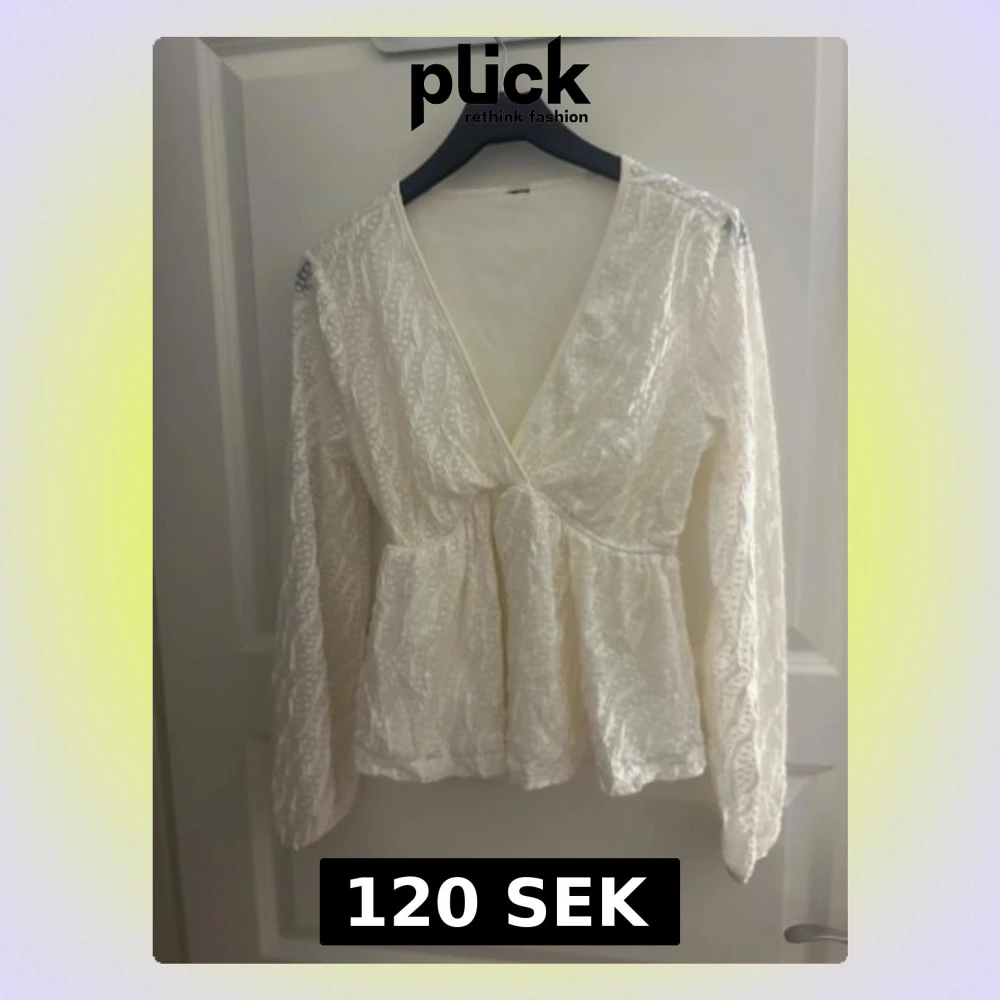 Säljer en vit blus med v-ringning och långa ärmar. Blusen har spetsdetaljer och ett lätt transparent material med ett snyggt mönster. Den har en omlott-look och är lite utsvängd nedtill💕