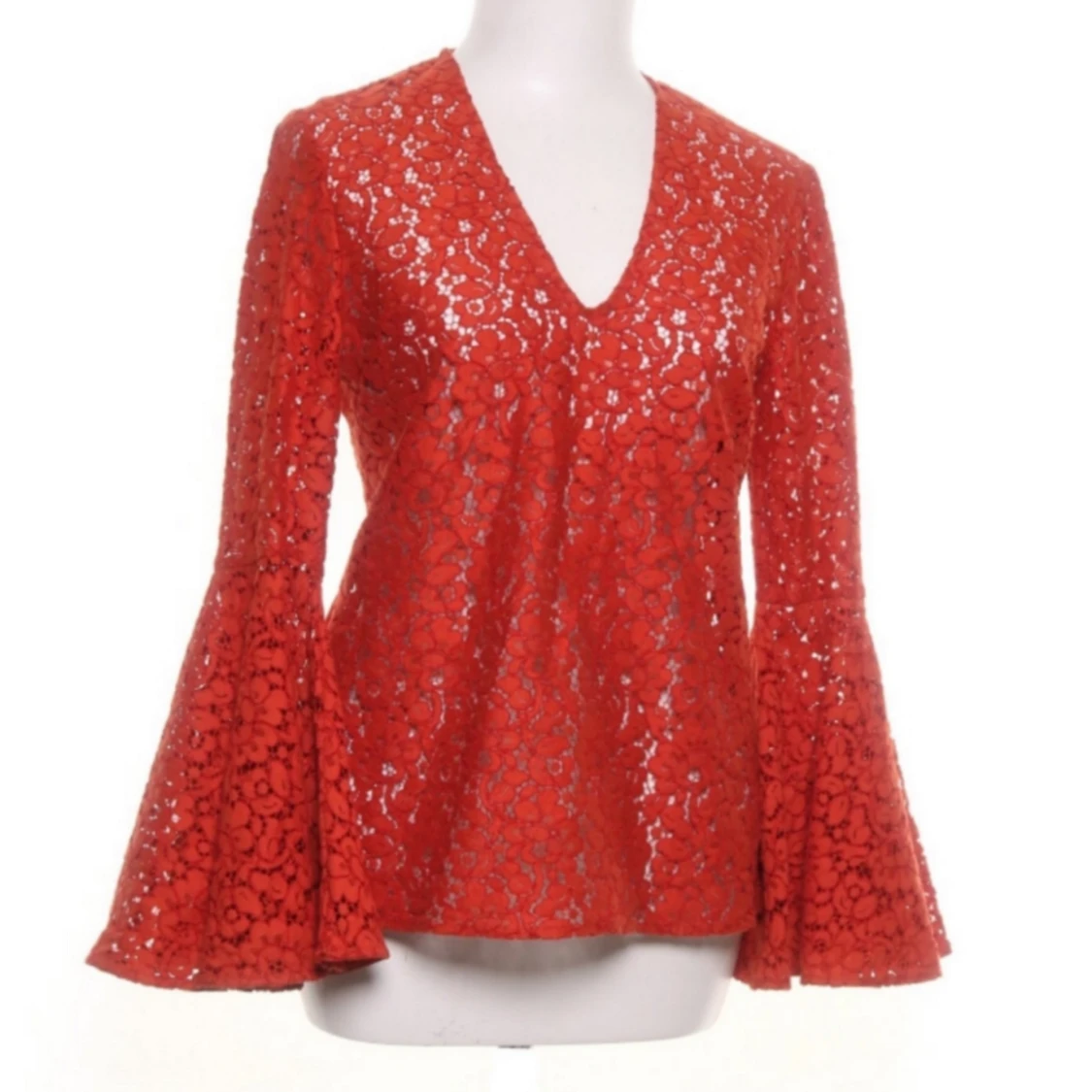 Färg: röd. Strl: XS. Snygg blus från Zara. Vida volang armar, V-ringad framtill. Passar perfekt till fest men även till vardags. Bra skick. Fraktkostnad tillkommer, betalning via swish.
