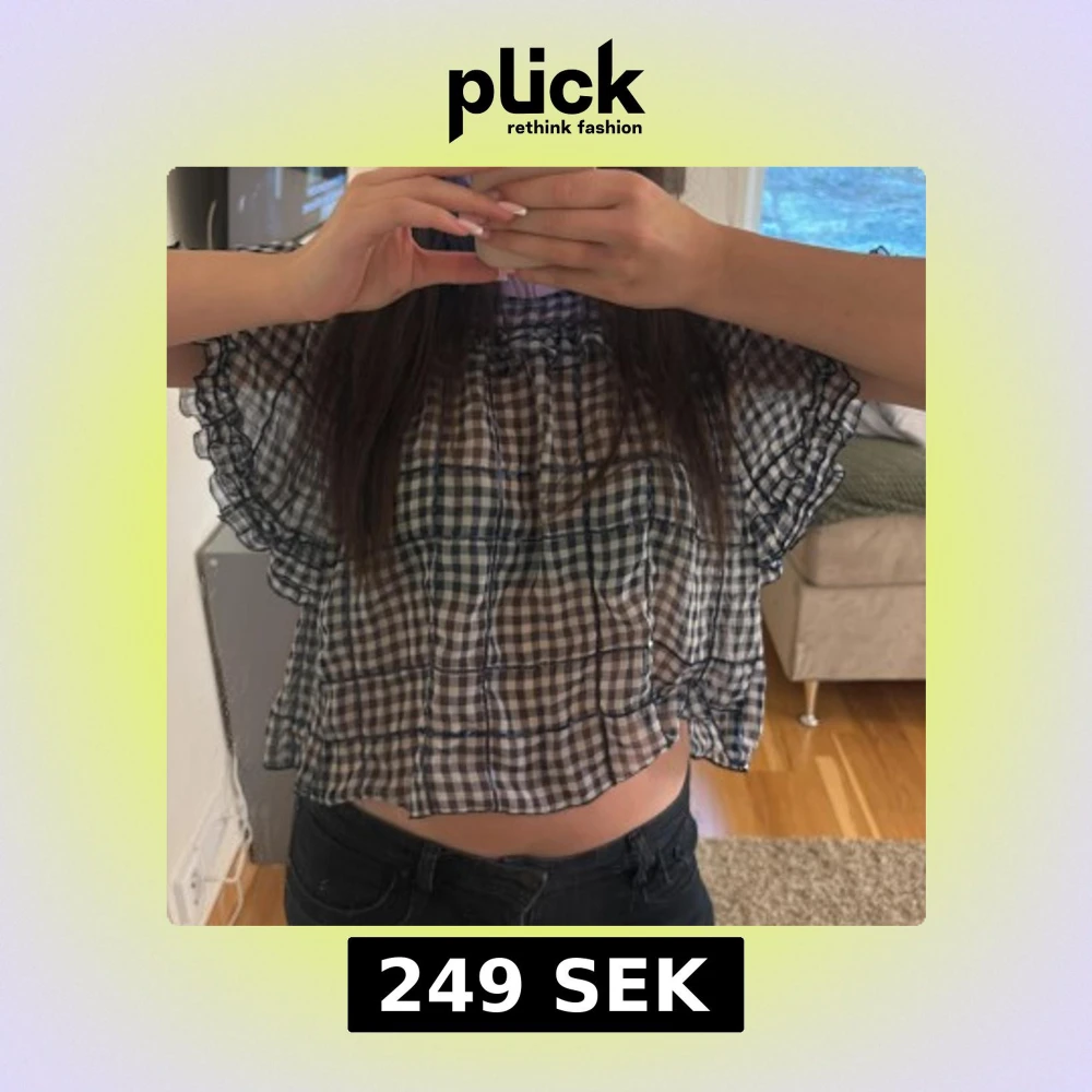 Säljer en luftig och transparent rutig blus i svart och vitt med volangdetaljer. Blusen har korta ärmar och en lös passform, perfekt för varmare dagar. Den är tillverkad i ett lätt syntetmaterial och har ett unikt rutmönster.