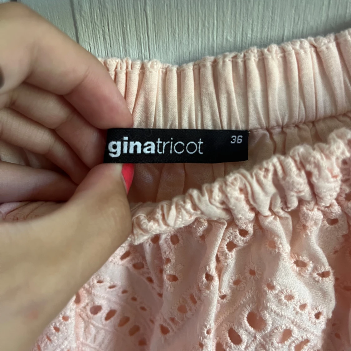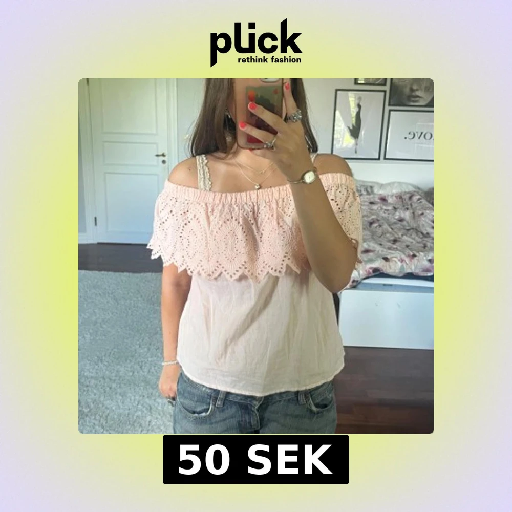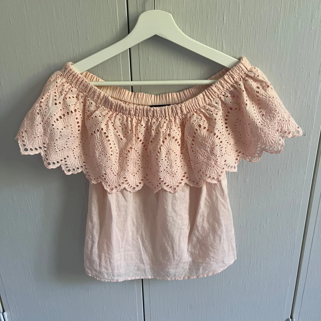 Superfin ljusrosa offshoulder topp frĂ„n Gina Tricot med broderad volang upptill. Toppen har en romantisk kĂ€nsla med snygga hĂ„lbroderier och elastisk kant som hĂ„ller den pĂ„ plats. Perfekt till jeans eller kjol för en söt look.đToppen Ă€r köpt begagnad men har inga defekter