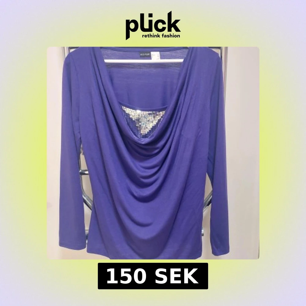 Snygg lila långärmad topp från Body Flirt med draperad front och glittriga paljetter vid halsringningen. Materialet känns mjukt och skönt mot huden. Från rök och djurfritt hem.