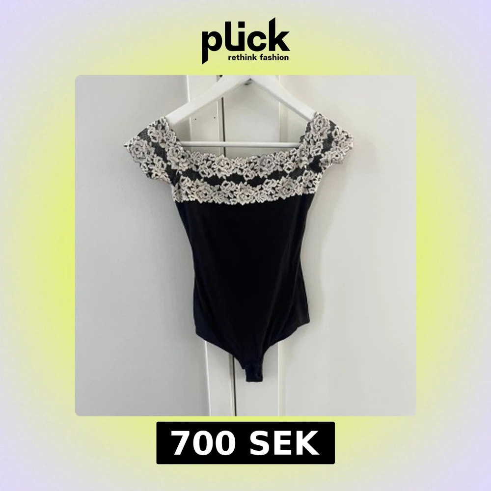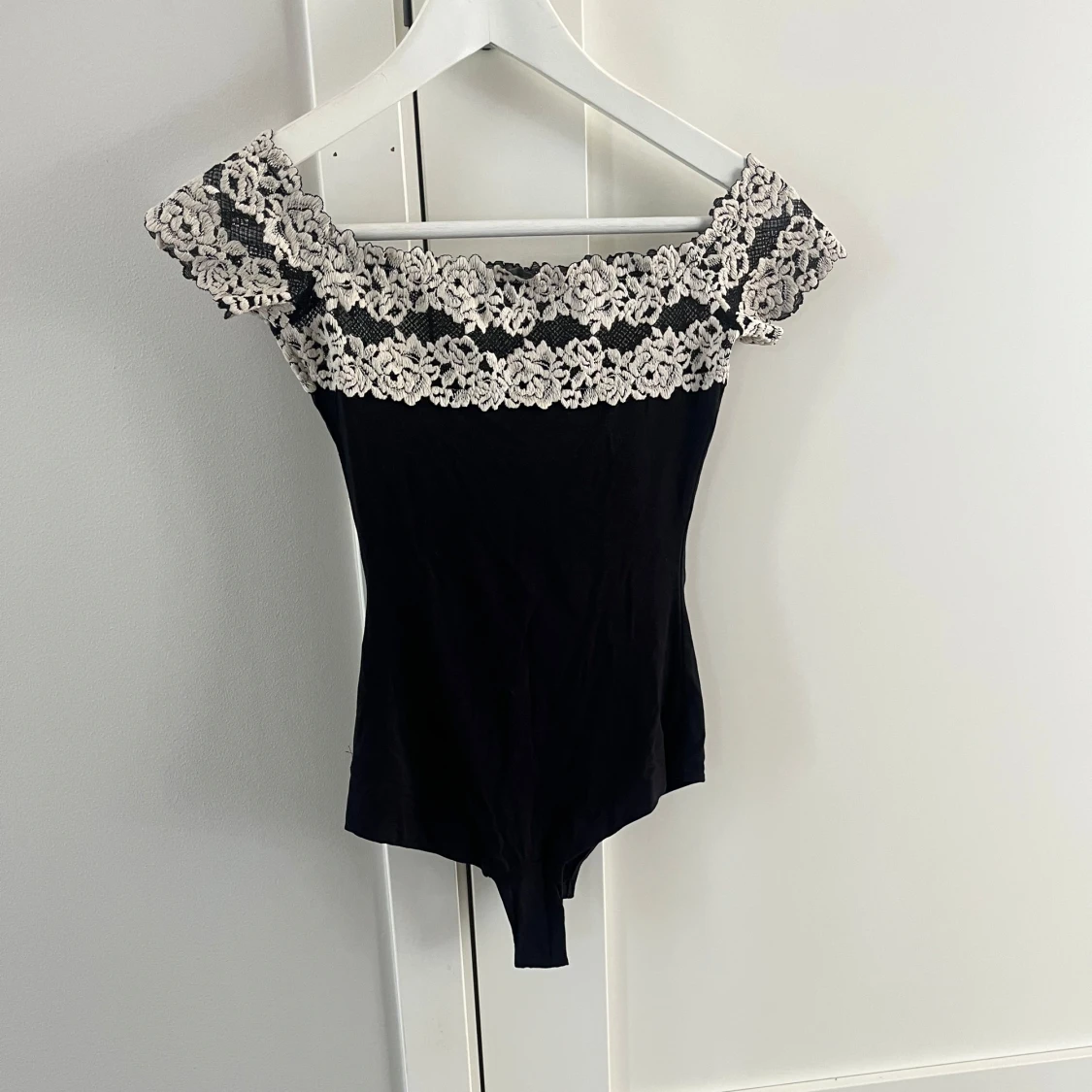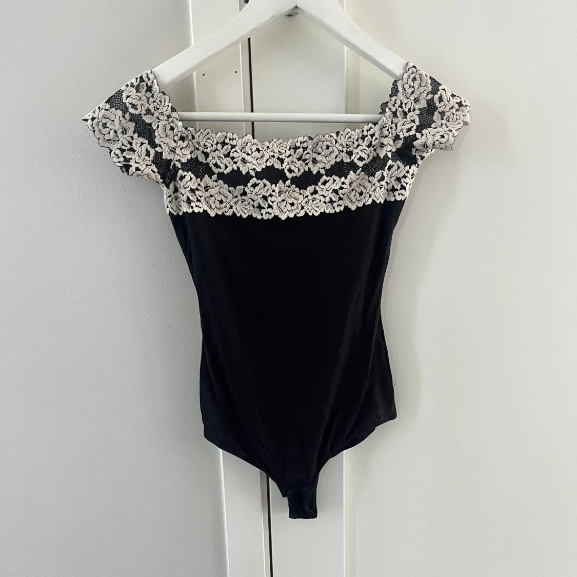 Supersnygg svart body från Intimissimi med bred offshoulder spets upptill i vitt och svart. Tight passform och axelbandslös design som ger en elegant vibe.