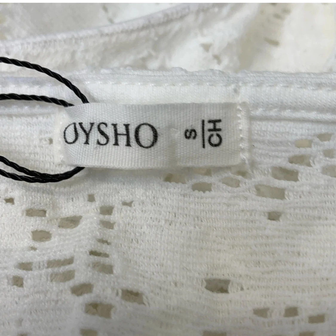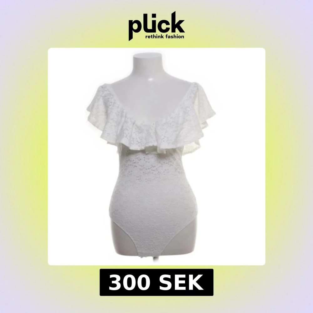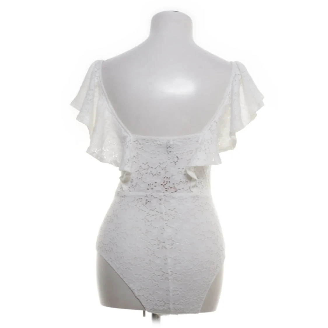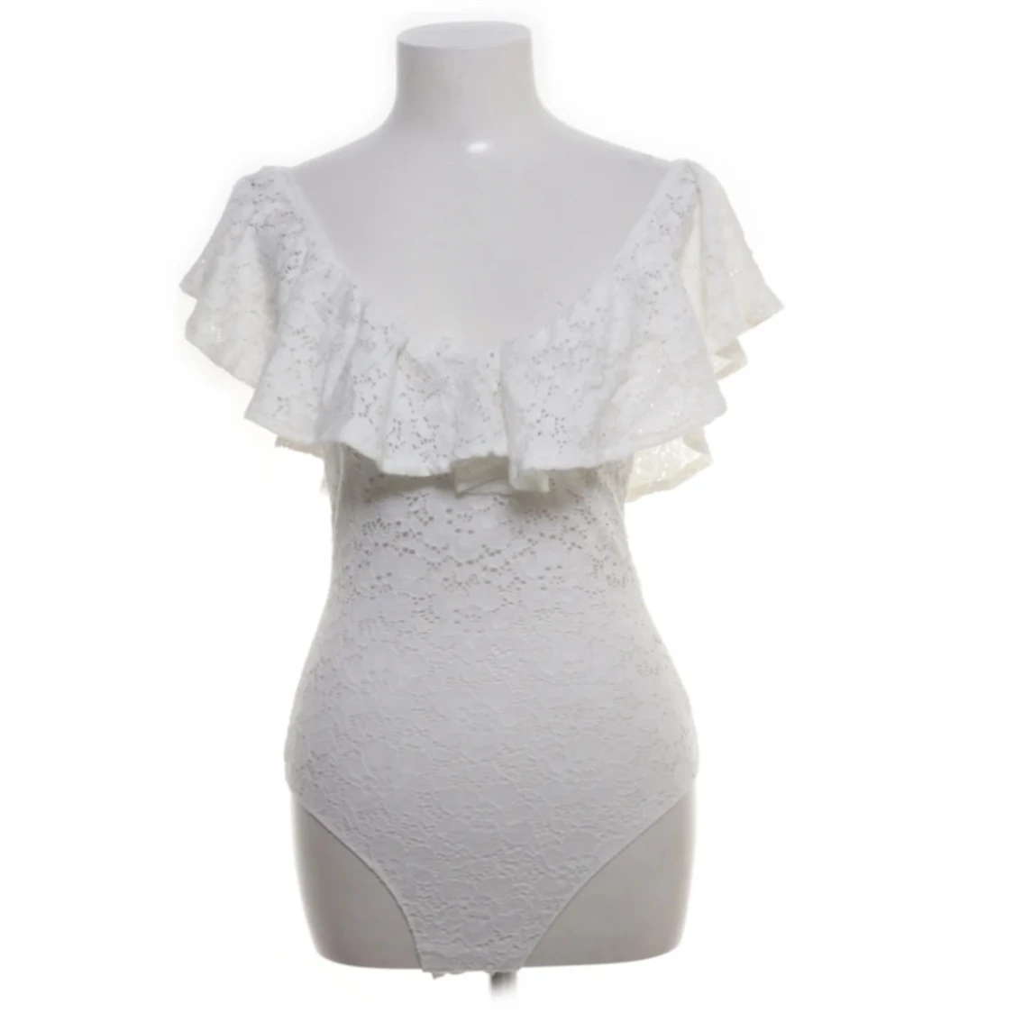 Superfin vit body från Oysho med romantiska volanger över axlarna och v-ringad hals. Hela bodyn är täckt av spetsliknande mönster som ger en söt och somrig känsla💗💗