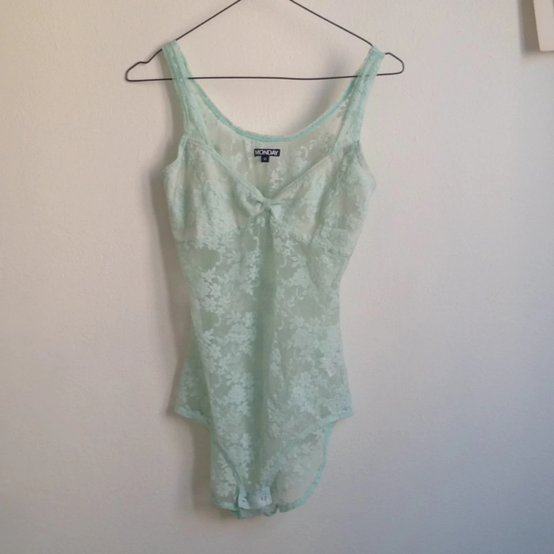 Mintgrön spetsbody från Weekday. Sparsamt använd. Supersnygg till höga byxor eller en hög kjol.