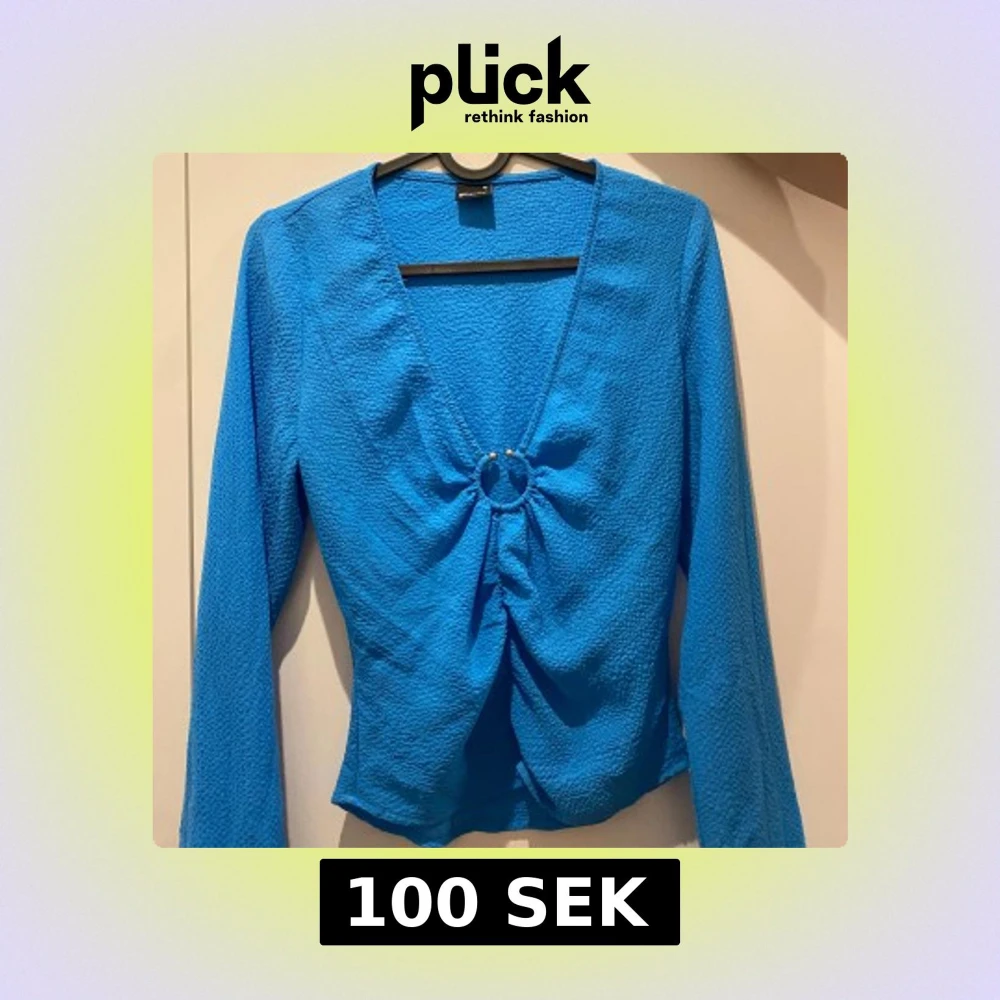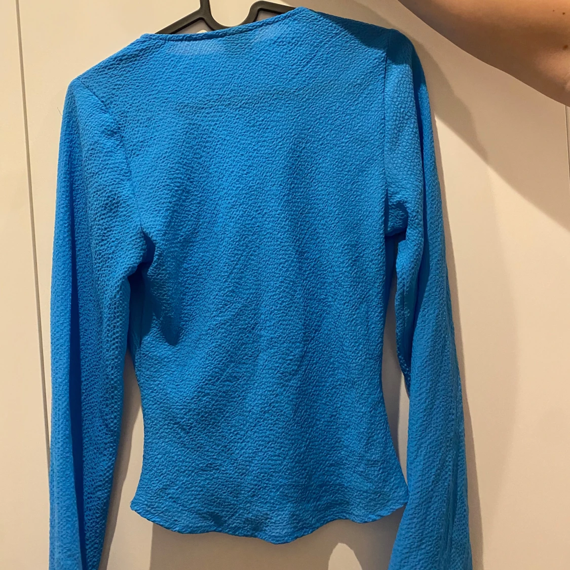 Snygg blå omlottopp från Gina Tricot med lång ärm och v-ringning. Toppen har en cool ringdetalj framtill med pärlor och lätt rynkad effekt. Materialet är strukturerat och har lite bredare armar nertill. perfekt till jeans eller kjol.