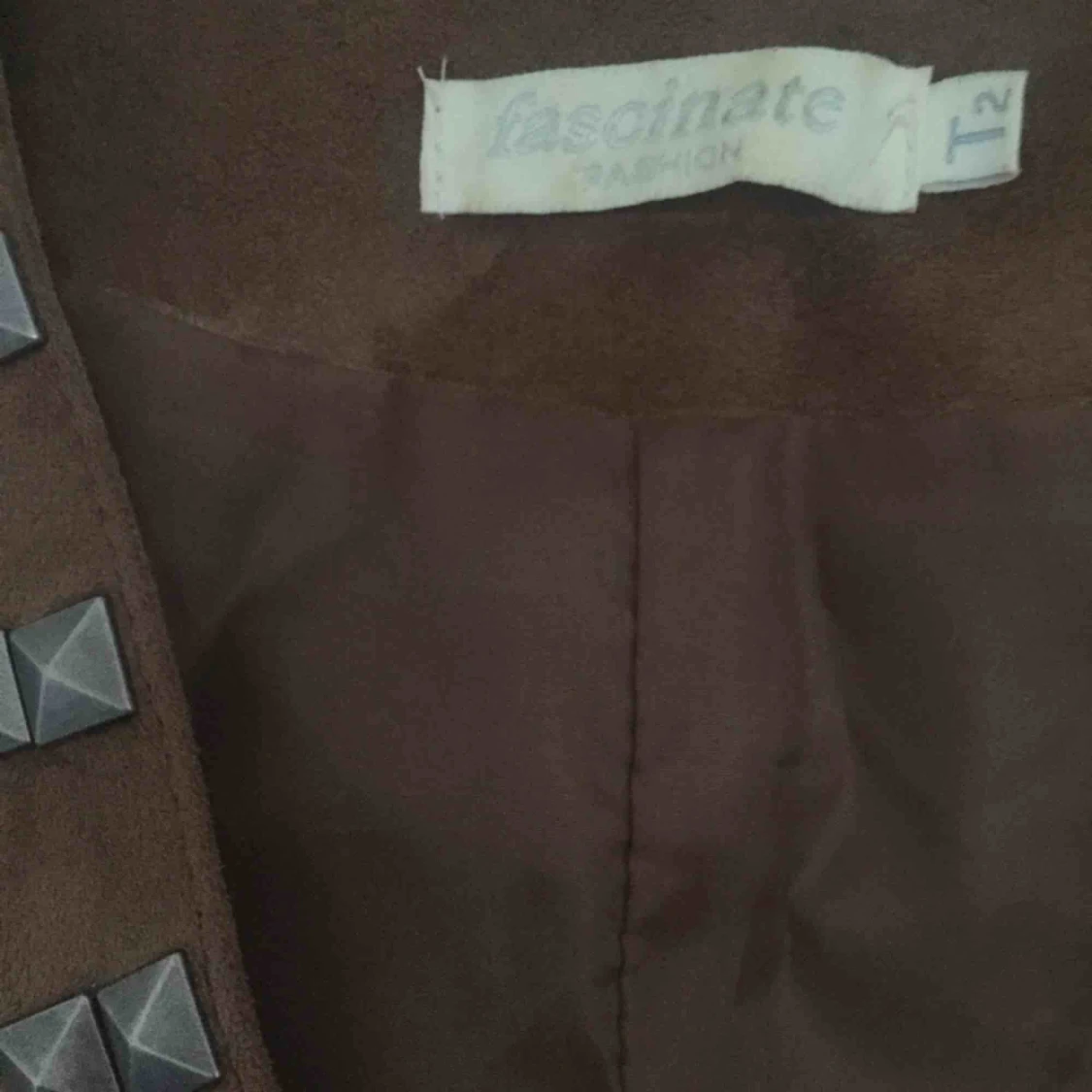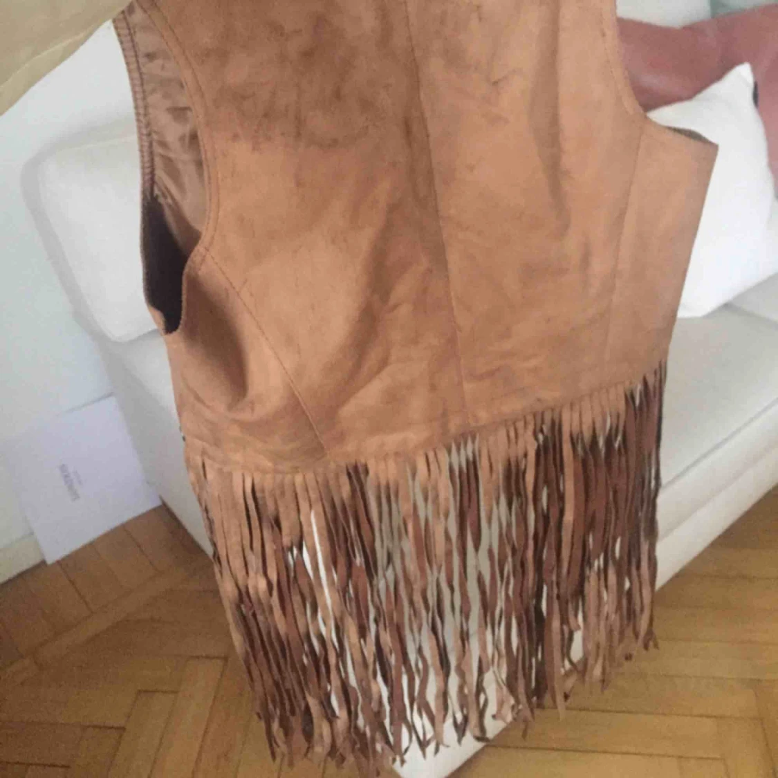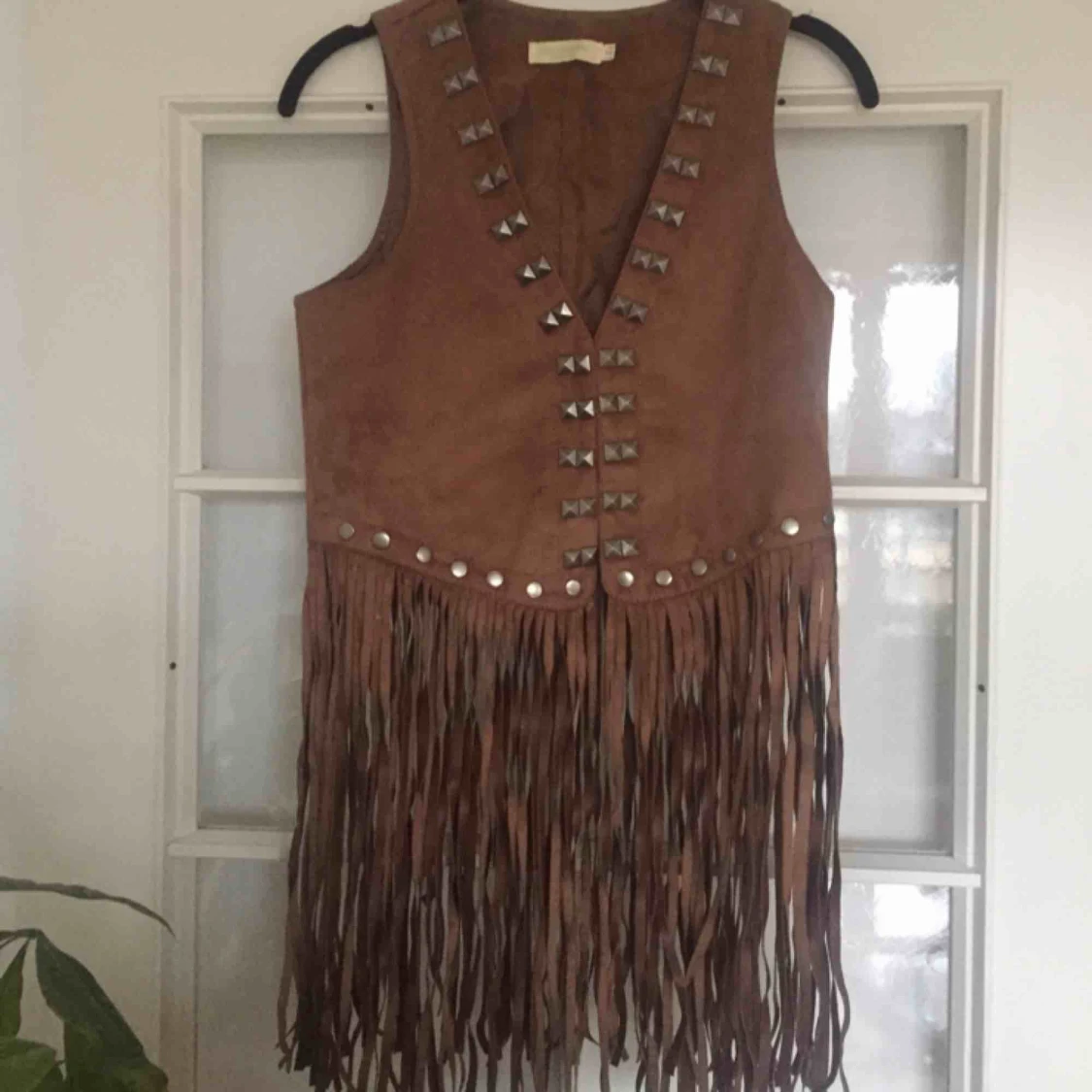 Jättehärlig mockaväst med fransar och någon slags nitar. Har haft den öppen de få ggr jag använt och då passar den nog XS-M. Stängd sitter den bra på mig som är en klassisk S.