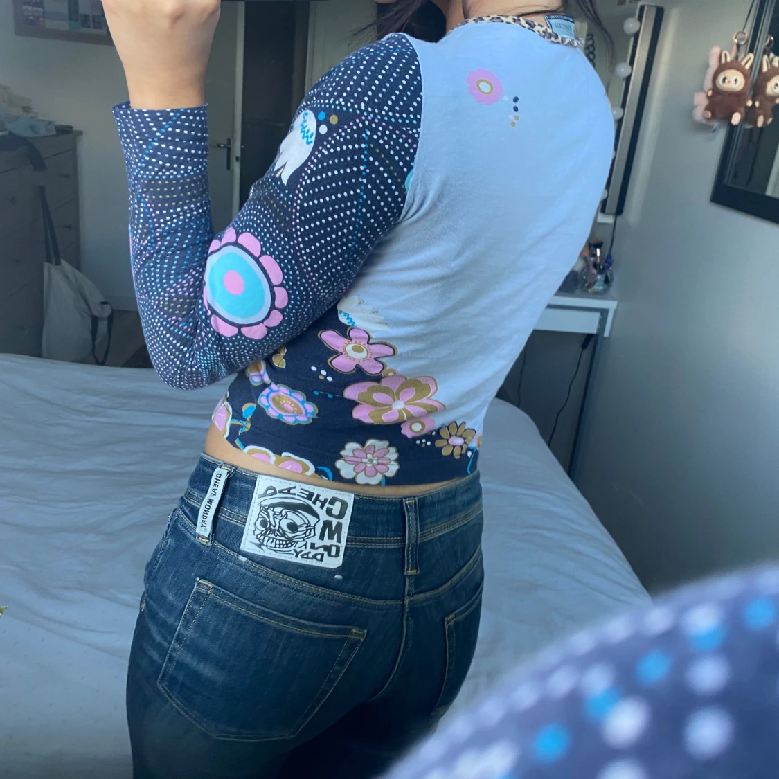 Säljer en superfin långärmad topp med blommigt mönster i blått, rosa och beige. Toppen är croppad och har v-ringning med leopardkant. Ärmarna har prickigt mönster och coola detaljer med blommor och fåglar. Perfekt för dig som gillar färg och unik stil!