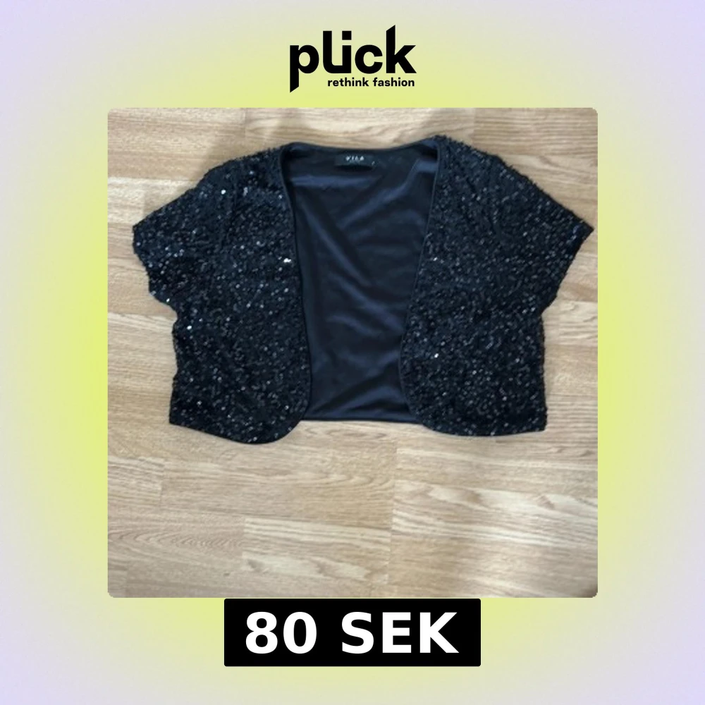 Glittrig svart bolerotopp från Vila, täckt med svarta paljetter som ger en riktigt festlig vibe. Kortärmad och croppad modell med öppen front, perfekt att slänga över en klänning eller topp för extra bling. Snygg och enkel att styla till olika looks.