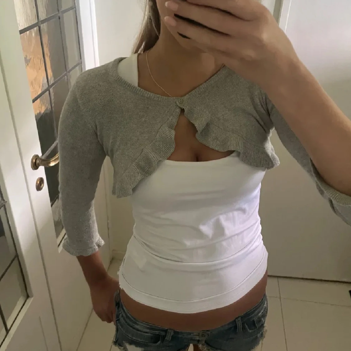 Säljer min superfina gråglittliga bolerotopp med trekvartsärm💕 storleken är en barnstorlek men funkar bra som xs och sitter super fint💕 pris kan diskuteras.