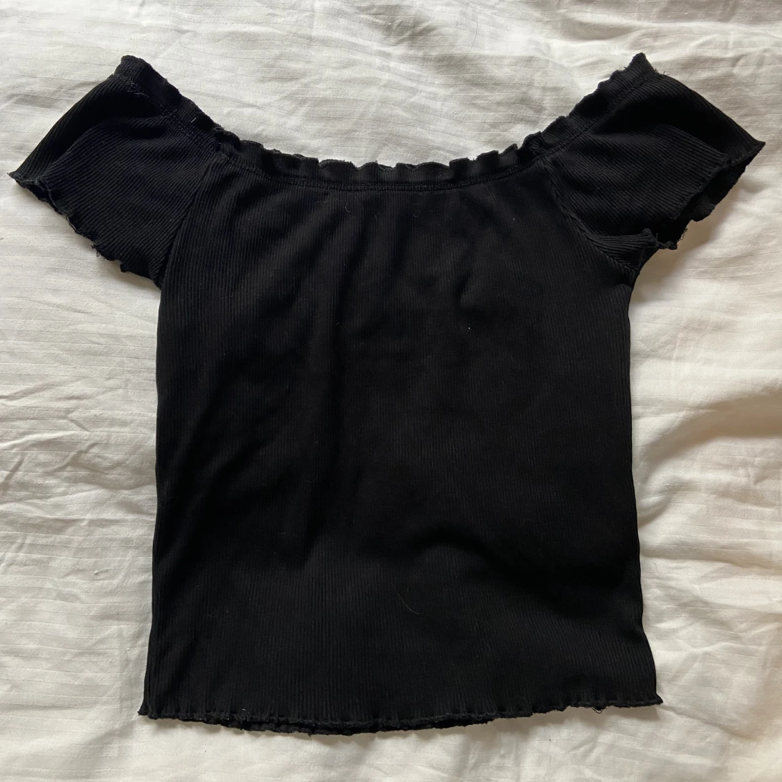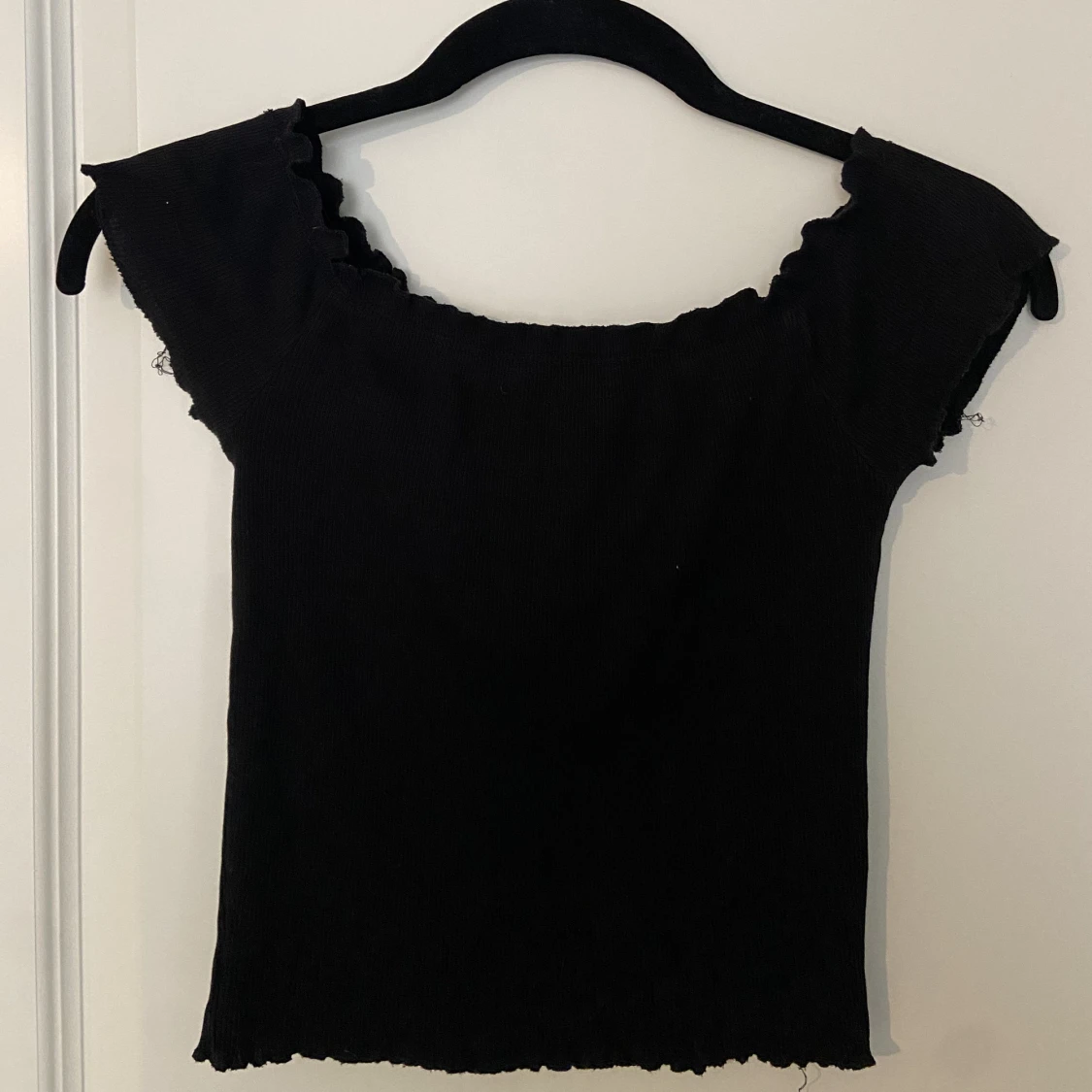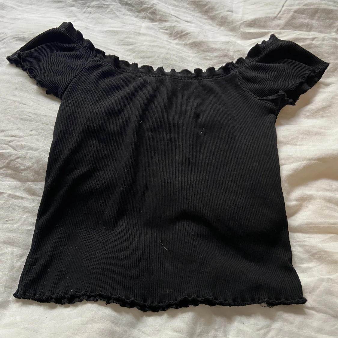Svart enkel men gullig topp. Ärmarna går längs bröstet och inte över axlarna men funkar att dra upp dom om man vill då den är stretchig. Små volanger längst upp och ett fint volangmönster längst ner. Finns någon lös tråd men inget som syns eller påverkar.