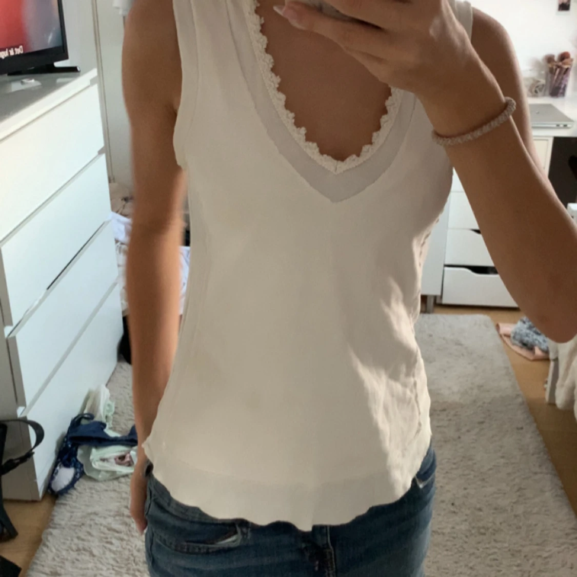 Säljer en söt vit linnetopp med v-ringning och spetsdetalj längs urringningen. Toppen är ärmlös och har en lätt, luftig känsla som passar perfekt till jeans eller kjol. Enkel och stilren design som är lätt att matcha.