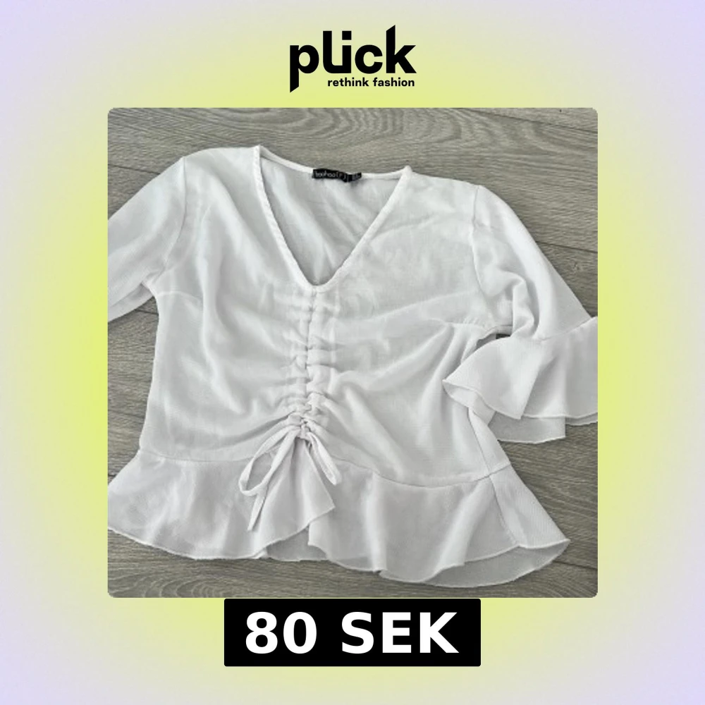 Säljer en stilren vit blus från Boohoo med v-ringning och volangdetaljer. Blusen har trekvartsärmar och ett knytband framtill som ger en snygg passform. Perfekt för en chic look!