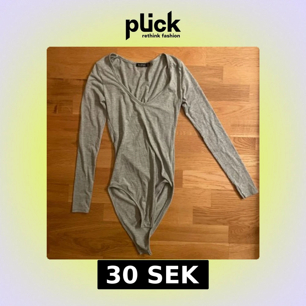En enkel och stilren grå bodysuit från Boohoo med djup v-ringning och långa ärmar. Tillverkad i mjuk bomullsblandning som sitter tight mot kroppen. Perfekt att styla med jeans eller kjol för en clean look.